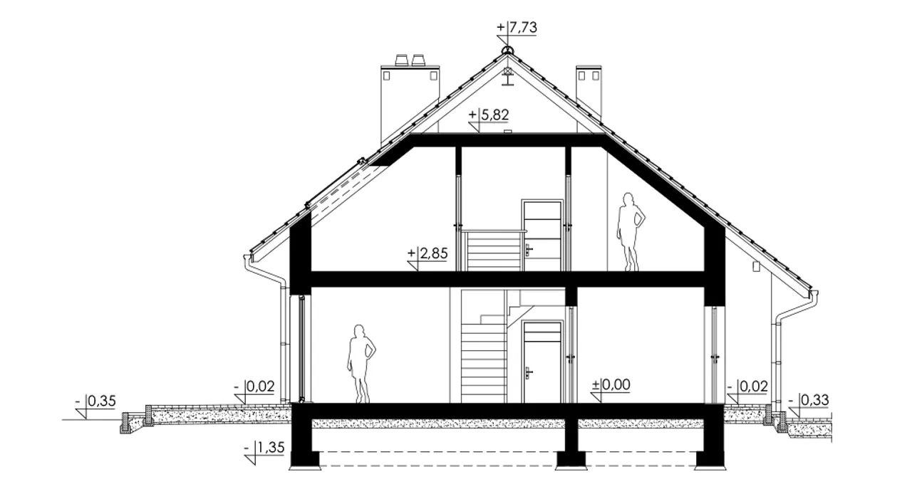 Budynek z dachem dwuspadowym (kąt nachylenia 38°) nie tylko wpisuje się w najnowsze trendy architektoniczne, ale także pozwala na efektywne wykorzystanie poddasza. Zastosowanie konstrukcji żelbetowej zapewnia wytrzymałość na lata, a ściany z pustaka ceramicznego LEIER o grubości 25 cm, ocieplone styropianem, pozytywnie wpływają na komfort termiczny i akustyczny we wnętrzach. Drewno w konstrukcji dachu oraz ceramiczne dachówki gwarantują szczelność i klasyczny wygląd bryły.