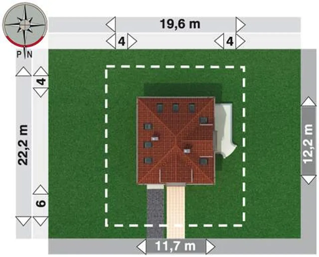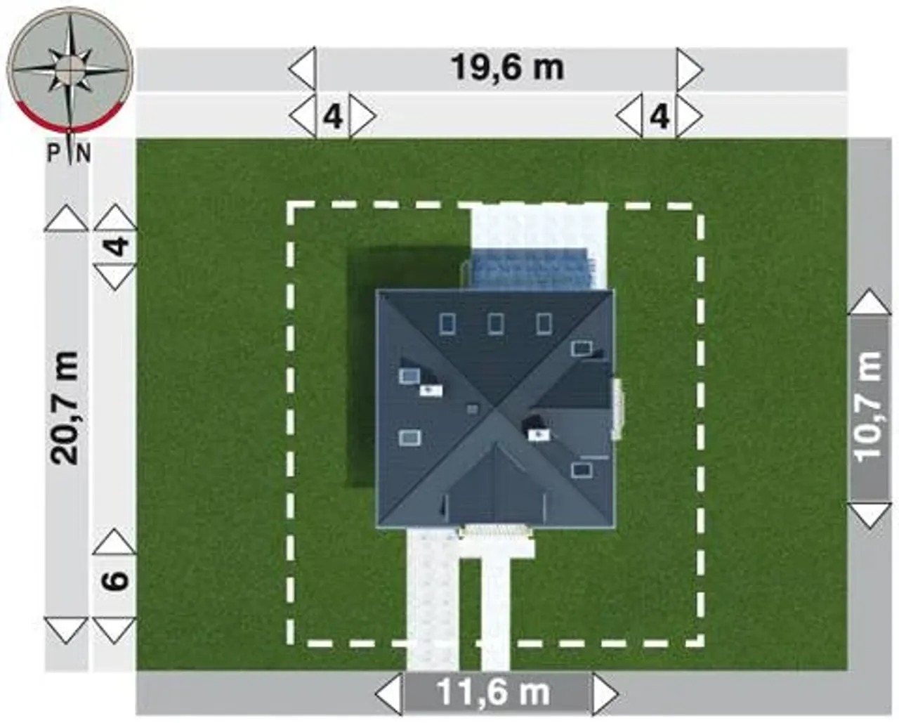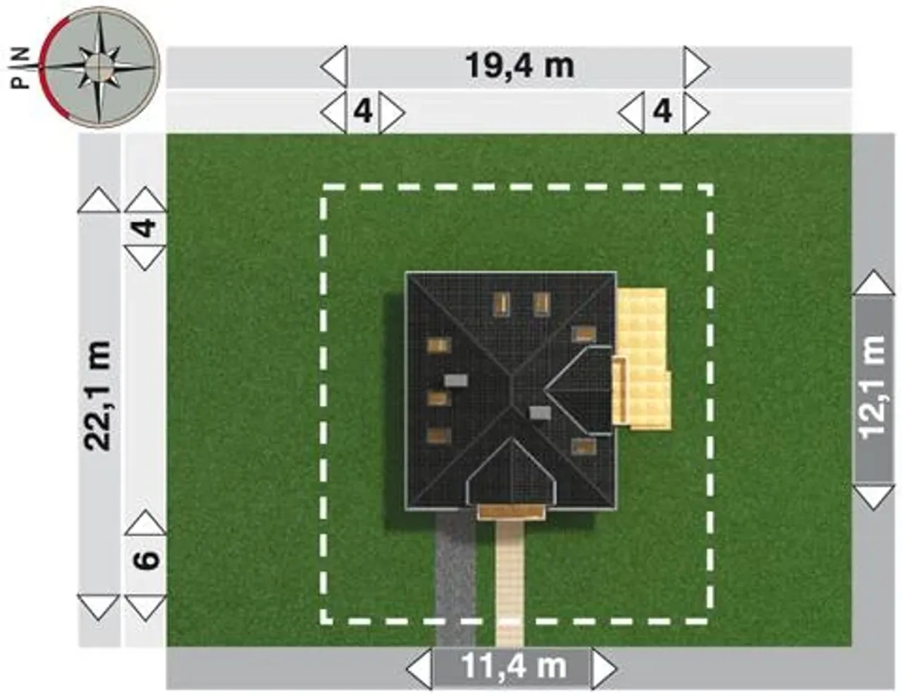 - rzut dachu - ukazuje jego kształt, wymiary, kąt nachylenia połaci, rozmieszczenie okien połaciowych, lukarn, świetlików i rur spustowych, pokazuje rozmieszczenie kominów i informuje o sposobie odwodnienia: rozmieszczeniu i rozmiarach rynien