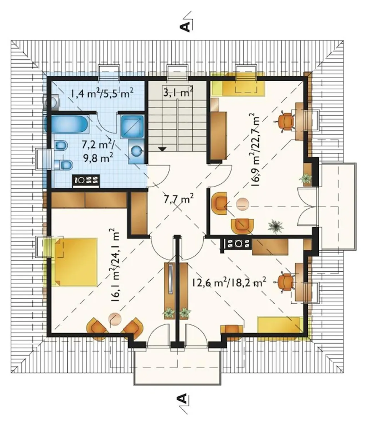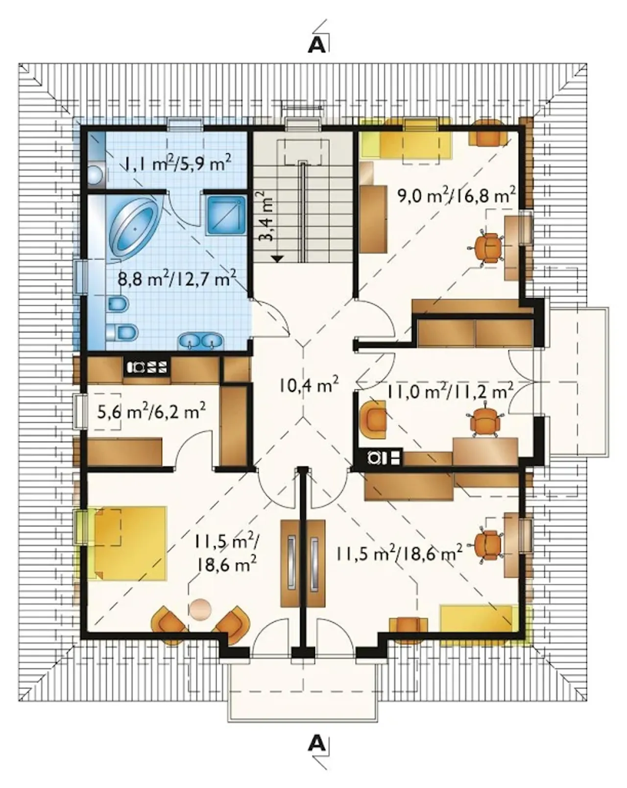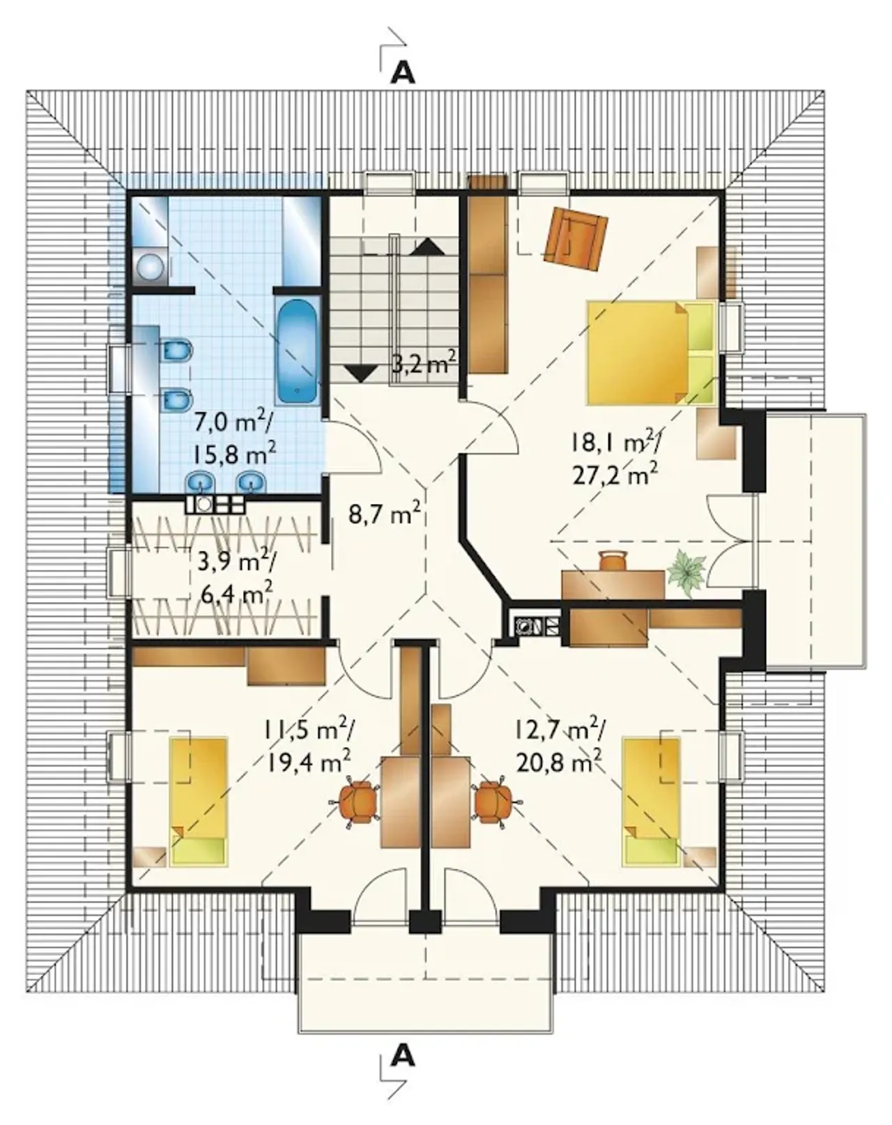 - rzut dachu - ukazuje jego kształt, wymiary, kąt nachylenia połaci, rozmieszczenie okien połaciowych, lukarn, świetlików i rur spustowych, pokazuje rozmieszczenie kominów i informuje o sposobie odwodnienia: rozmieszczeniu i rozmiarach rynien