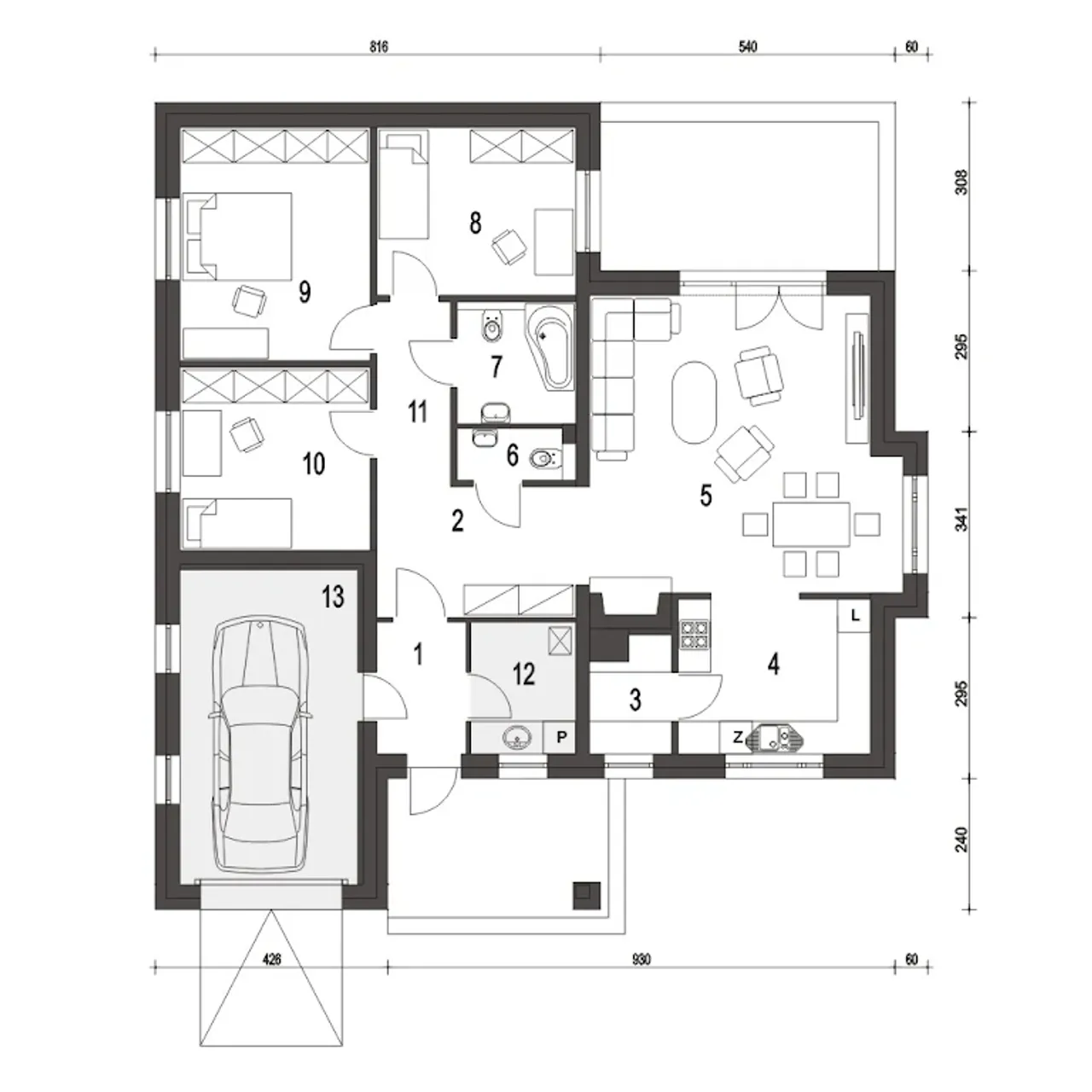 Wypełnij formularz i otrzymaj rysunki w pdf z dokładnymi wymiarami budynku i pomieszczeń (długość, szerokość, wysokość) dla projektu Radek III z garażem 1-st. A