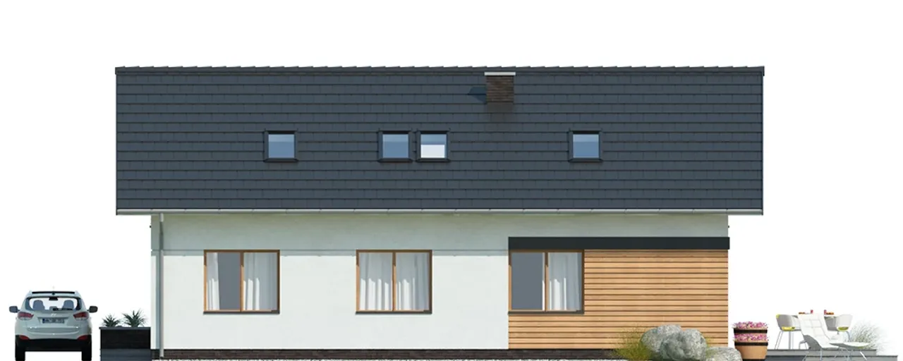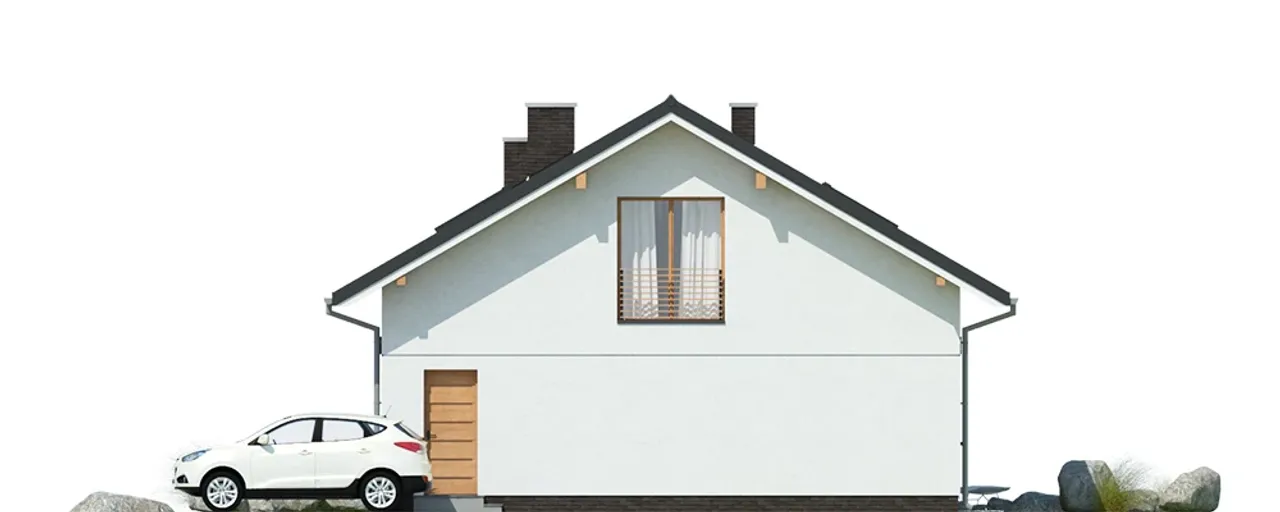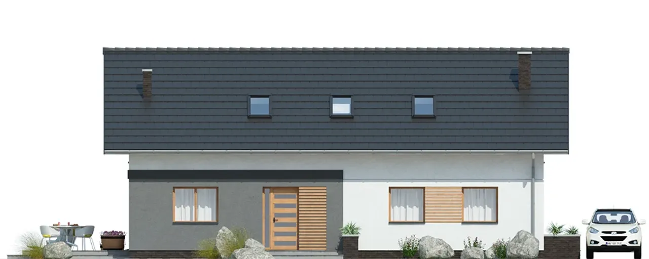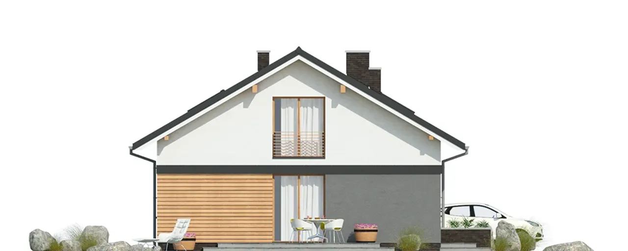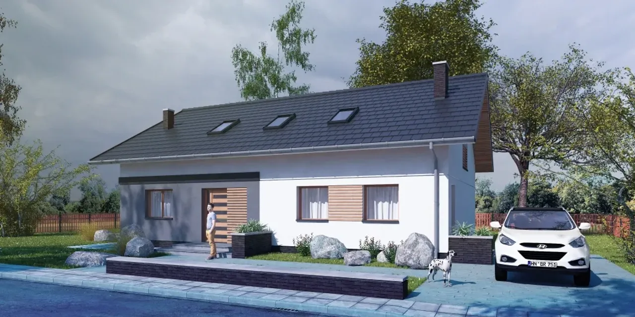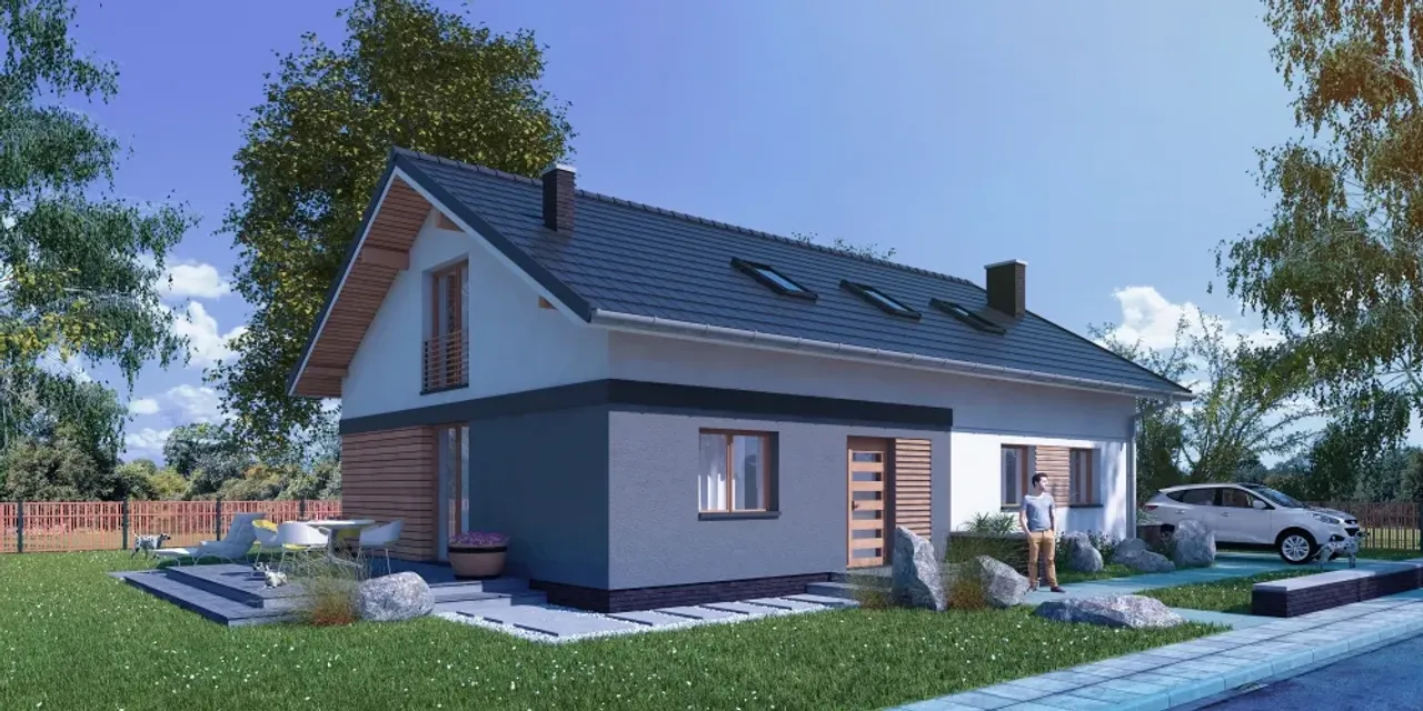 Charakterystyczny dwuspadowy dach z drewnianą konstrukcją, przykryty dachówką ceramiczną, harmonijnie wpisuje się w nowoczesny styl całej bryły. Parter i poddasze zapewniają dużą elastyczność aranżacyjną - 5 przestronnych pokoi pozwoli zorganizować zarówno strefy prywatne, jak i wspólne, a kominek w salonie stanie się miejscem rodzinnych spotkań w chłodne dni.