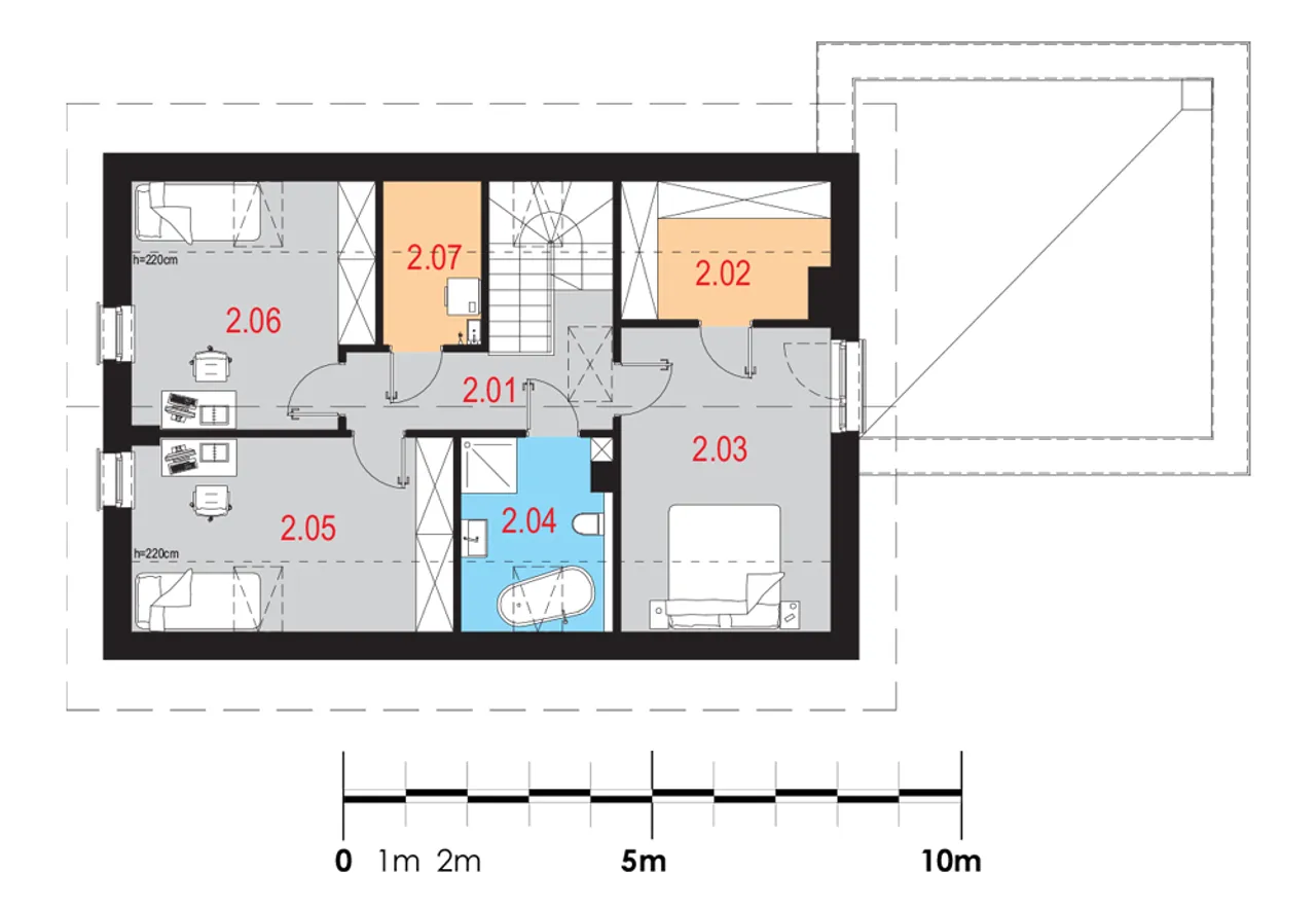Projekt przewiduje cztery wygodne pokoje na parterze oraz poddasze, które można zaadaptować na dodatkowe cele. Przemyślany układ funkcjonalny obejmuje praktyczną pralnię, pojemną kotłownię oraz otwartą strukturę części dziennej. Przestrzeń sprzyja integracji domowników i realizacji wspólnych pasji - zarówno w domu, jak i na zewnątrz. Wysokość ściany kolankowej (124,5 cm) pozwala efektywnie zagospodarować każdą część poddasza, dając poczucie swobody nawet przy mniejszych połaciach dachu.