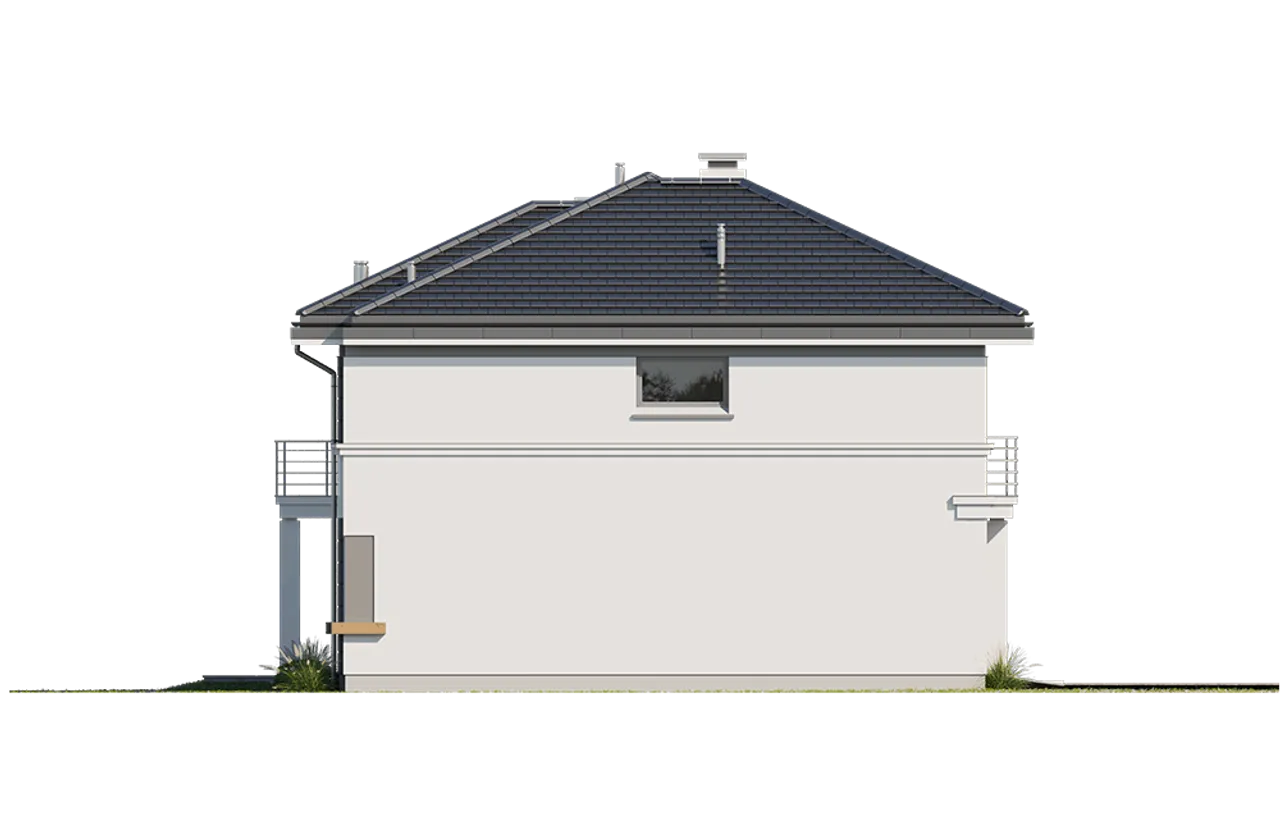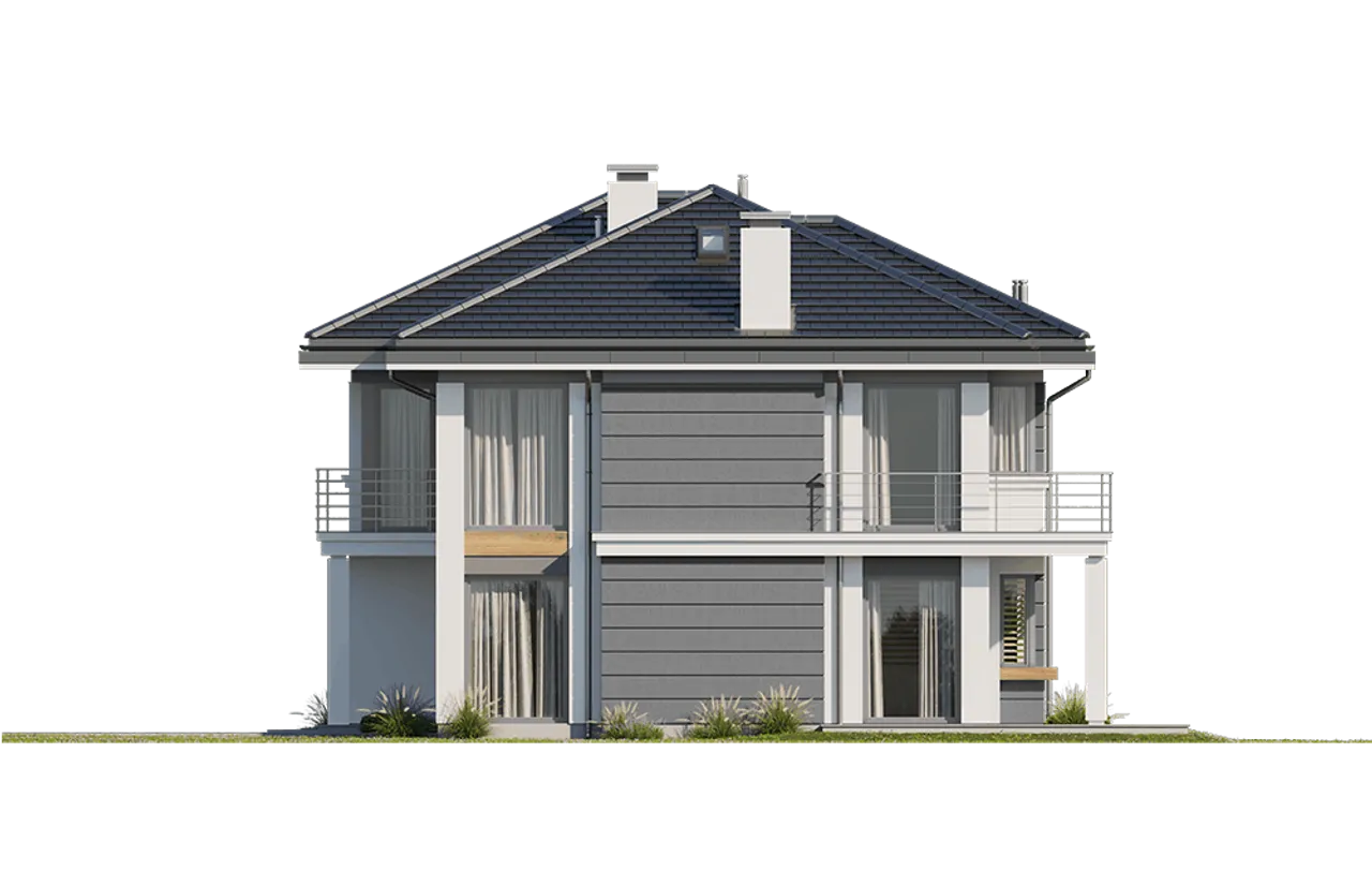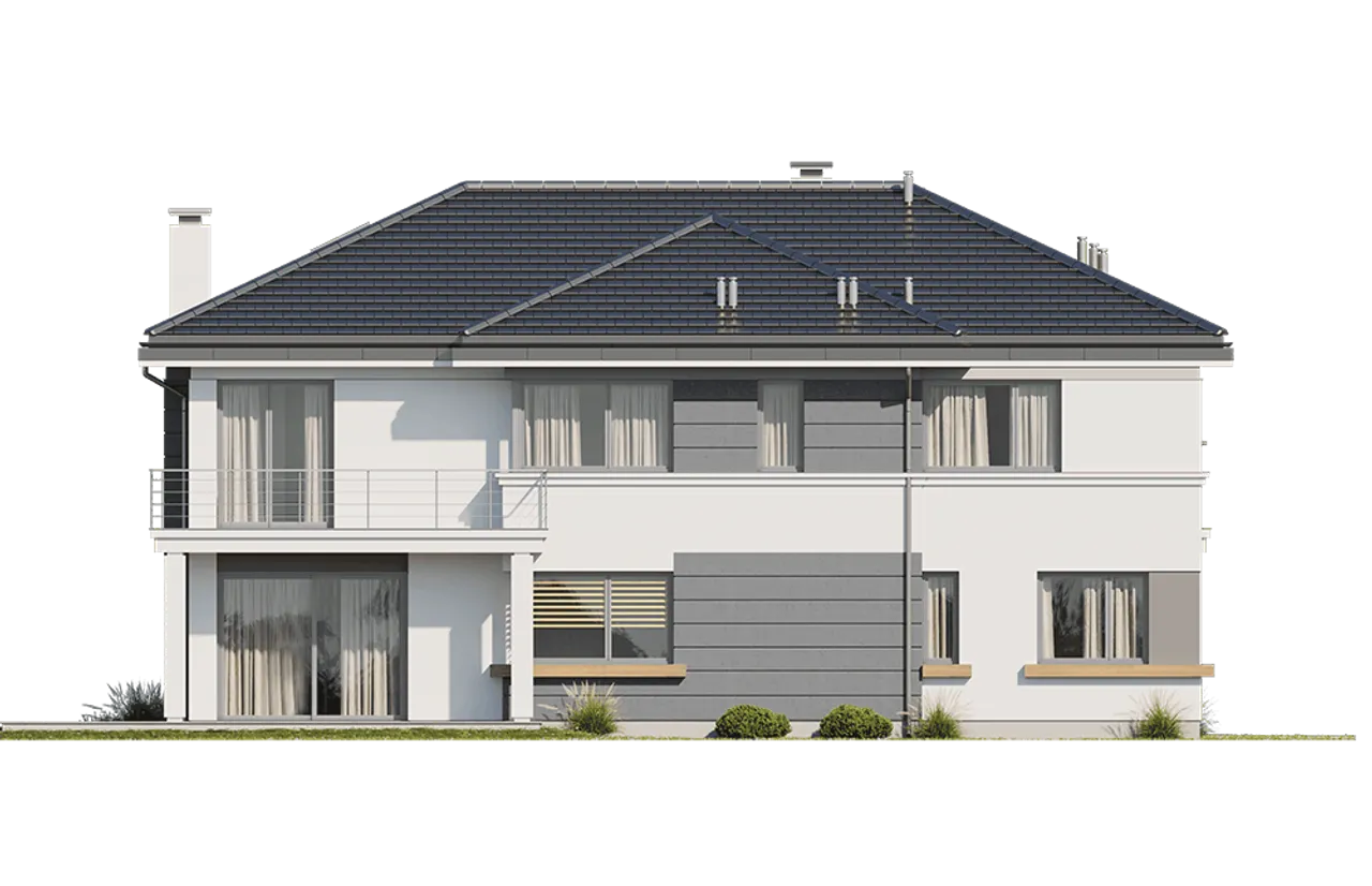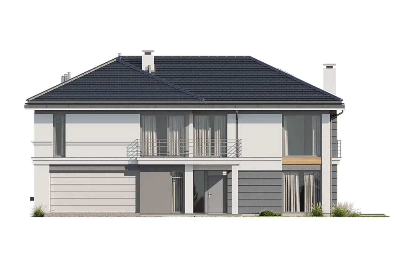 Wariant projektu z trzema sypialniami od strony ogrodu na górze o wyrównanej powierzchni + trochę większa łazienka ogólna,schody zmienione z półokrągłych na prostokątne – trzybiegowe, likwidacja pustki nad salonem – dodatkowy otwarty pokój rekreacyjnProjekt domu Riwiera 3 wariant C, to kolejna wersja popularnego projektu Riwiera - tym razem wariant domu poszerzonego, o mniejszej głębokości, nadającego się na płytszą i szerszą działkę, Riwiera 3 to wygodny komfortowy dom dla cztero-sześcioosobowej rodziny. Budynek jest piętrowy, z wbudowanym w bryłę dwustanowiskowym garażem. Dom przeznaczony jest dla cztero-sześcioosobowej rodziny. Powierzchnia użytkowa: 227.75m2. Budynek może być posadowiony na działce od 500 m2. Projekt przewiduje ogrzewanie wodne zasilane piecem gazowym. Cechą charakterystyczną projektu Riwiera 3 są piękne duże okna - część z nich sięga od podłogi do sufitu. Wnętrze domu podzielono na część dzienną na parterze oraz sypialnie na piętrze. Do domu wchodzimy przez obszerną sień z przejściem do kotłowni i garażu. Następnie przechodzimy do holu, połączonego z pokojem dziennym i kuchnią ( ze spiżarnią), które razem tworzą dużą otwartą przestrzeń. Z holu dostępne są także : schody na piętro, niewielka łazienka i dodatkowy pokój ( gabinet lub sypialnia gościnna ). Nad jadalnią zostawiono otwarty sufit na antresolę piętra, z oknami o wysokości dwóch kondygnacji. Z salonu wychodzimy na częściowo zadaszony taras i do ogrodu. Na piętrze przewidziano cztery sypialnie, w tym apartament rodziców w osobnej części domu, z własną łazienką i garderobą. Sypialnie dziecięce mają dodatkową łazienkę - z holu. Istnieje możliwość zamknięcia pustki nad salonem i zaprojektowania piątego pokoju na piętrze. Charakterystyka Energetyczna dla tego projektu jest zgodna z aktualnie obowiązującymi przepisami prawa budowlanego.