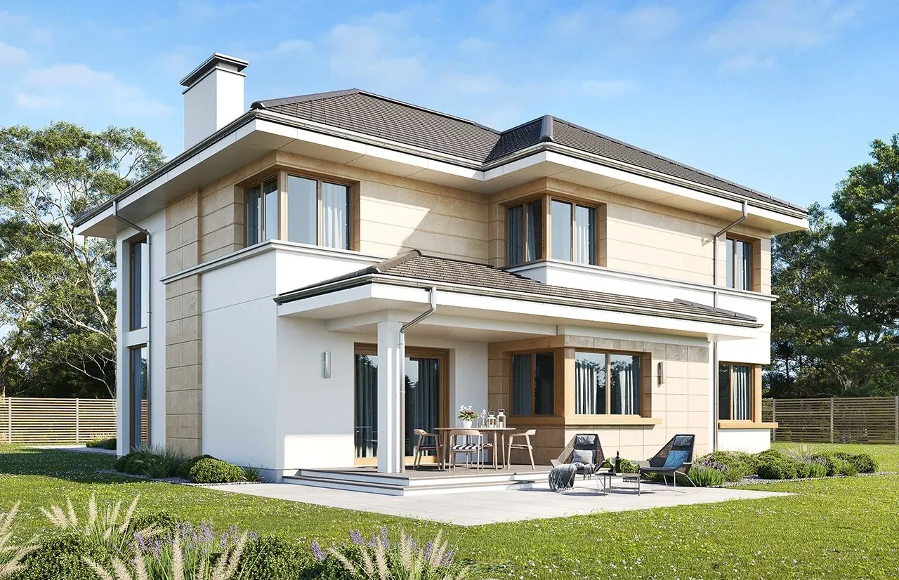 Dom Riwiera 5 wariant B to funkcjonalność skrojona na miarę potrzeb wymagających rodzin. Budynek powstaje na solidnych, betonowych ławach i ścianach fundamentowych z bloczków betonowych, co minimalizuje ryzyko wilgoci oraz wydłuża żywotność całej konstrukcji. Ściany z pustaków porotherm z dodatkową warstwą styropianu zapewniają doskonałą izolację termiczną, a cienkowarstwowy tynk elewacyjny nadaje bryle świeży, współczesny wygląd.