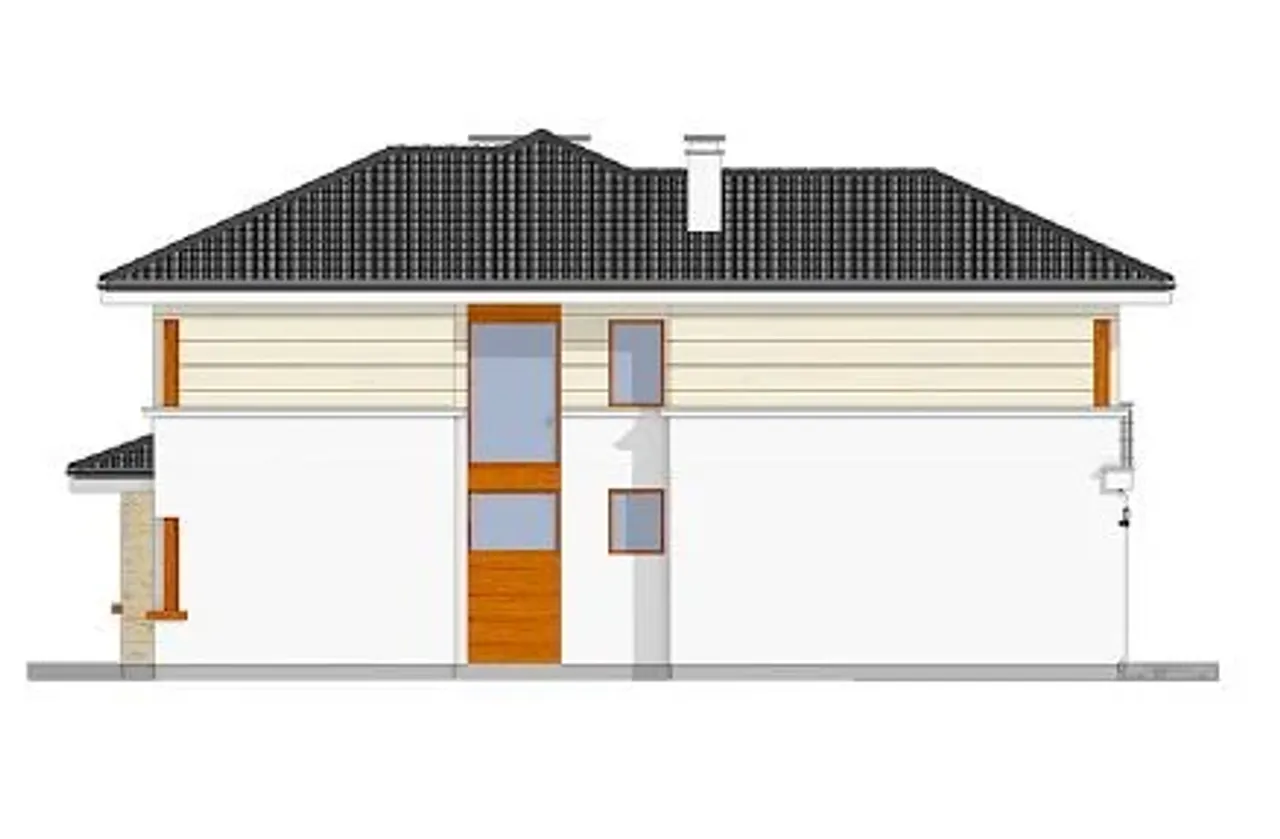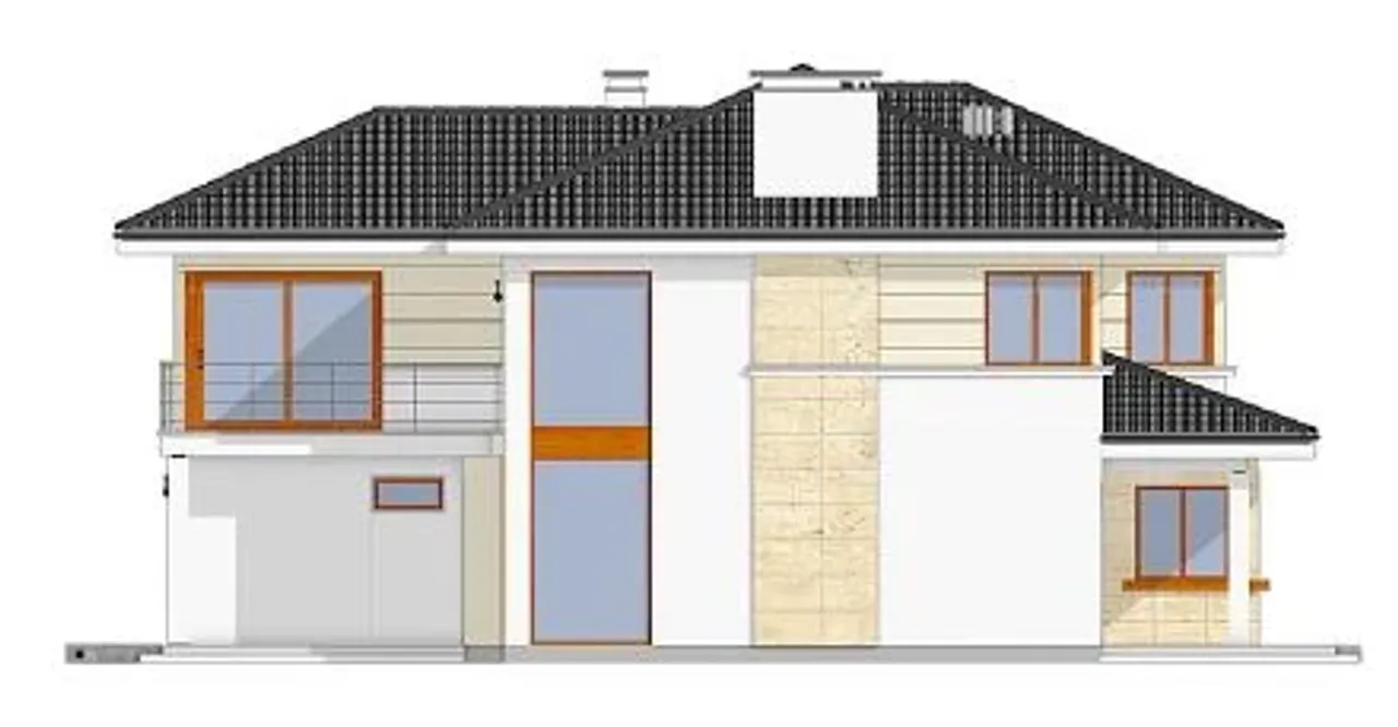 Projekt domu Riwiera to oryginalny, piętrowy dom przeznaczony dla cztero-sześcioosobowej rodziny w formie jednopiętrowej bryły w kształcie litery T, przekrytej łagodnie wielospadowym dachem. Dom podpiwniczony z dustanowiskowym garażem. Cechą charakterystyczną projektu Riwiery są piękne duże okna - część z nich sięga od podłogi do sufitu. Powierzchnia użytkowa: 204,31 m2. Budynek może być posadowiony na działce od 500 m2. Projekt przewiduje ogrzewanie wodne zasilane piecem gazowym. Od strony ogrodowej zaprojektowano przytulny taras przykryty częściowo zadaszeniem podcienia. Na parterze projektu Riwiera większość miejsca zajmuje przestrzeń dzienna, z pięknym dwukondygnacyjnym salonem - z antresolą na piętrze, z jadalnią, holem z reprezentacyjnymi schodami i częściowo otwartą kuchnią. Dodatkowo na parterze przewidziano pokój - gabinet lub zapasową sypialnię, oraz garaż. Schodami schodzimy do piwnicy, gdzie znajdują się pomieszczenia techniczne. Na piętrze zaprojektowano trzy sypialnie z garderobami, dwie łazienki (w tym jedna należąca do odizolowanego apartamentu rodziców z tarasem), oraz pralnię. Duży hol - antresola stanowi naturalne przedłużenie salonu. Charakterystyka Energetyczna dla tego projektu jest zgodna z aktualnie obowiązującymi przepisami prawa budowlanego.