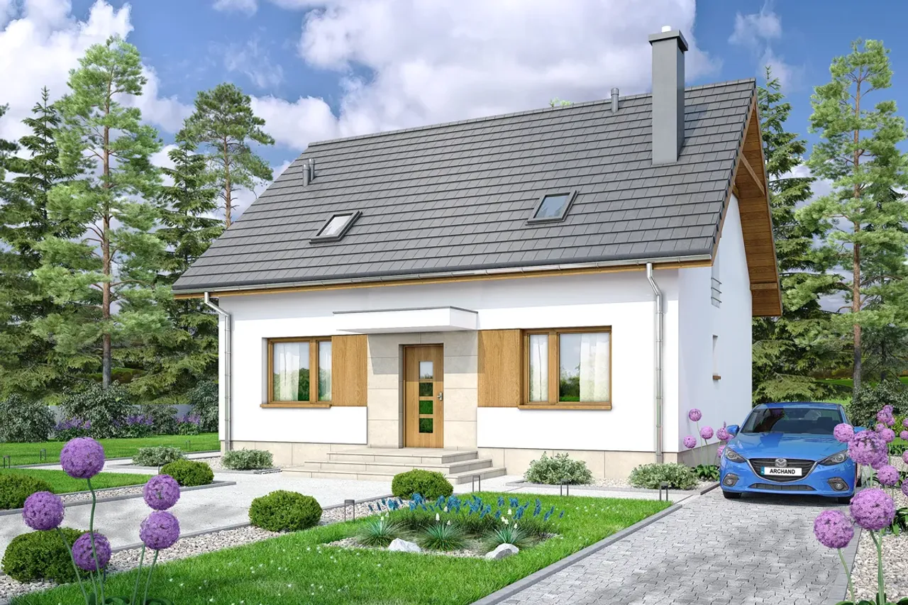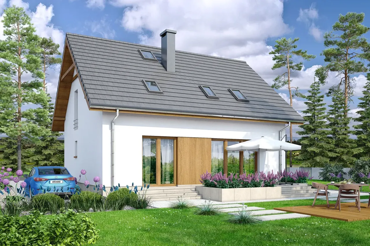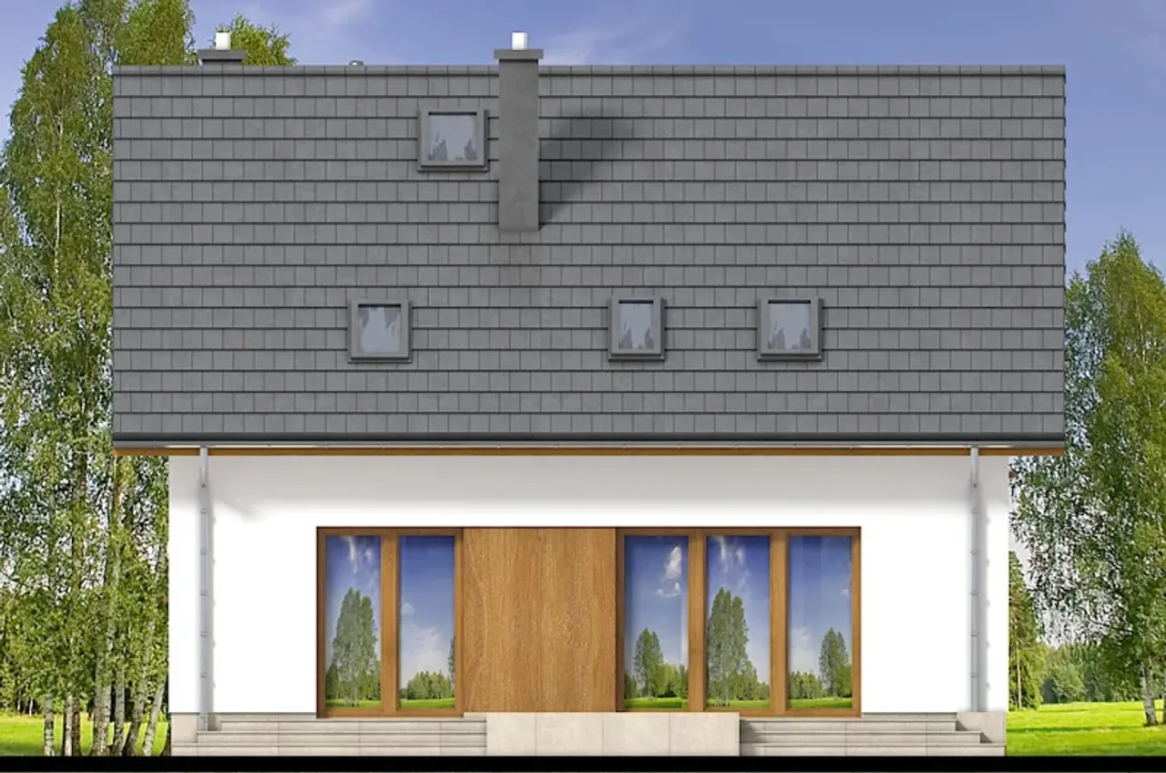 Dom budowany według tego projektu sprawdzi się na działkach z drogą od południa lub północy. Harmonijna kompozycja materiałów budowlanych i klasyczny, dwuspadowy dach podkreślają nowoczesny charakter, jednocześnie zapewniając ponadczasową estetykę i oszczędność kosztów eksploatacji.