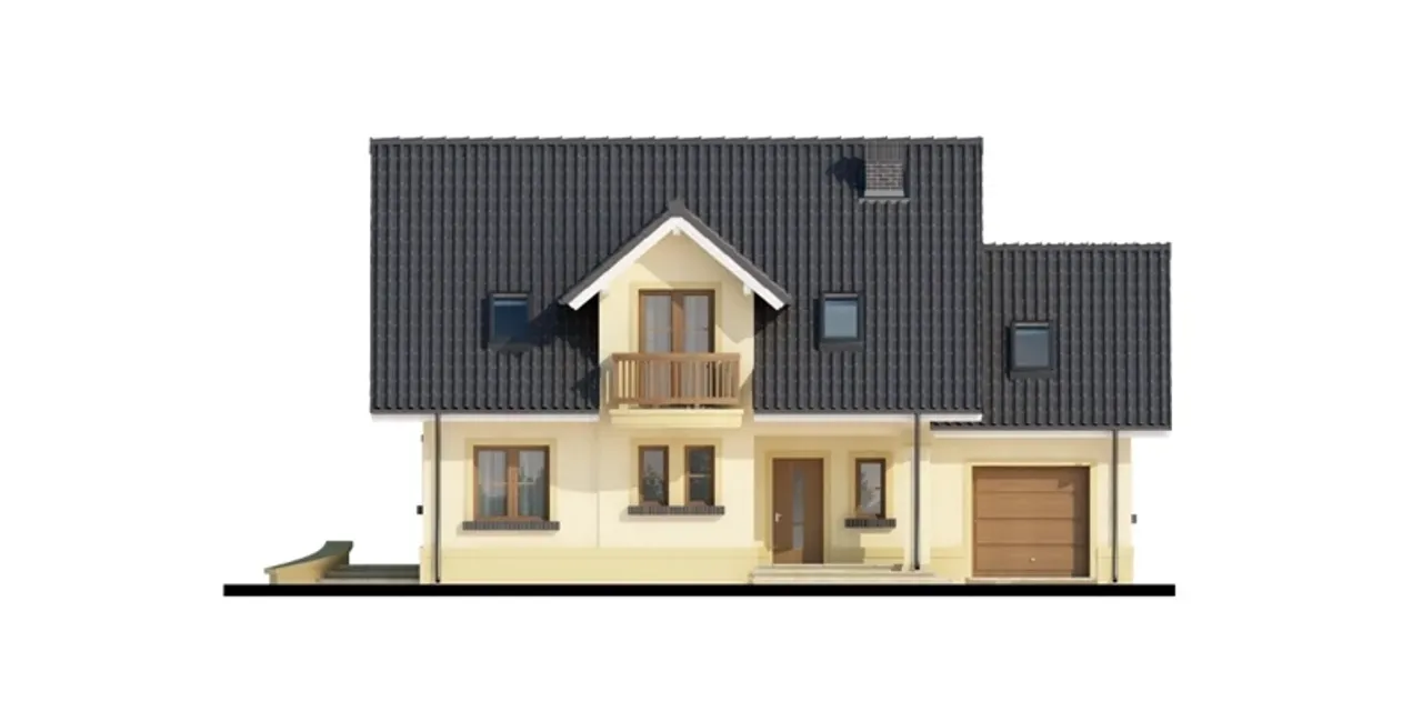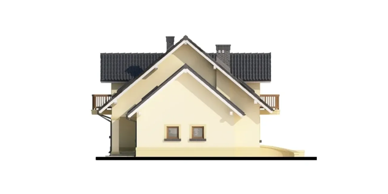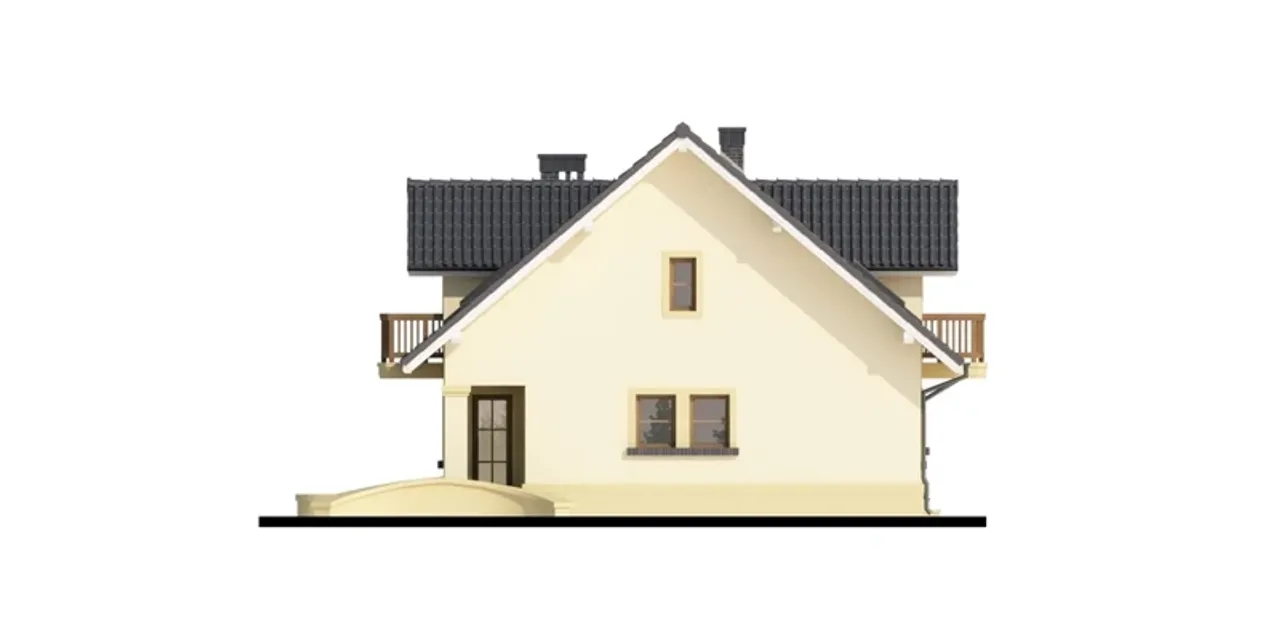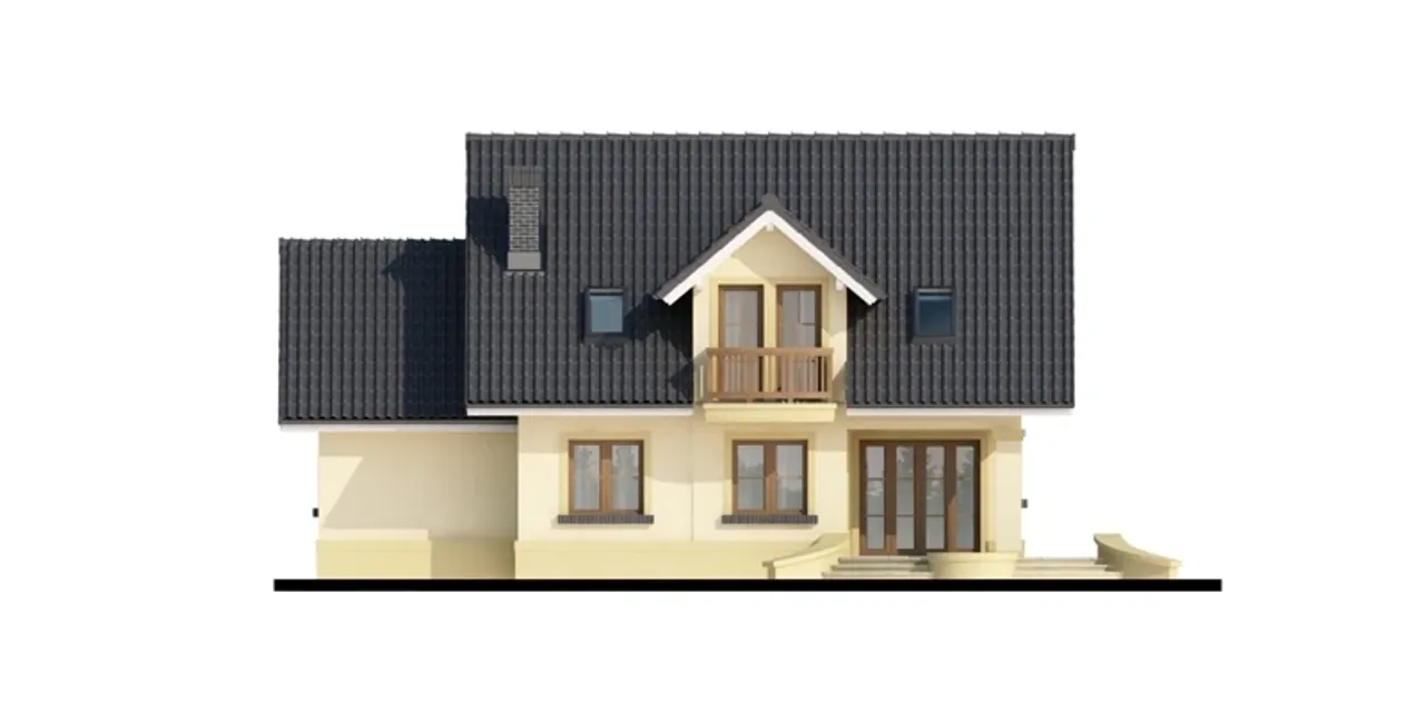 Projekt domu Rozeta to parterowy dom z poddaszem pokryty dachem dwuspadowym, budynek posiada prostą budowę, od strony frontowej umieszczono drzwi wejściowe oraz wjazd do garażu jednostanowiskowego, z którego możemy dostać się bezpośrednio do pomieszczenia gospodarczego. W projekcie Rozeta od strony ogrodu znajduje się częściowo zadaszony taras oraz balkon na poddaszu..