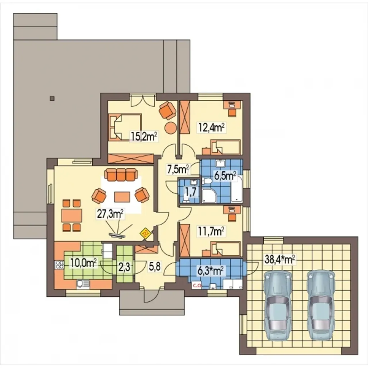 Wypełnij formularz i otrzymaj rysunki w pdf z dokładnymi wymiarami budynku i pomieszczeń (długość, szerokość, wysokość) dla projektu Rysiek wersja C z podwójnym garażem