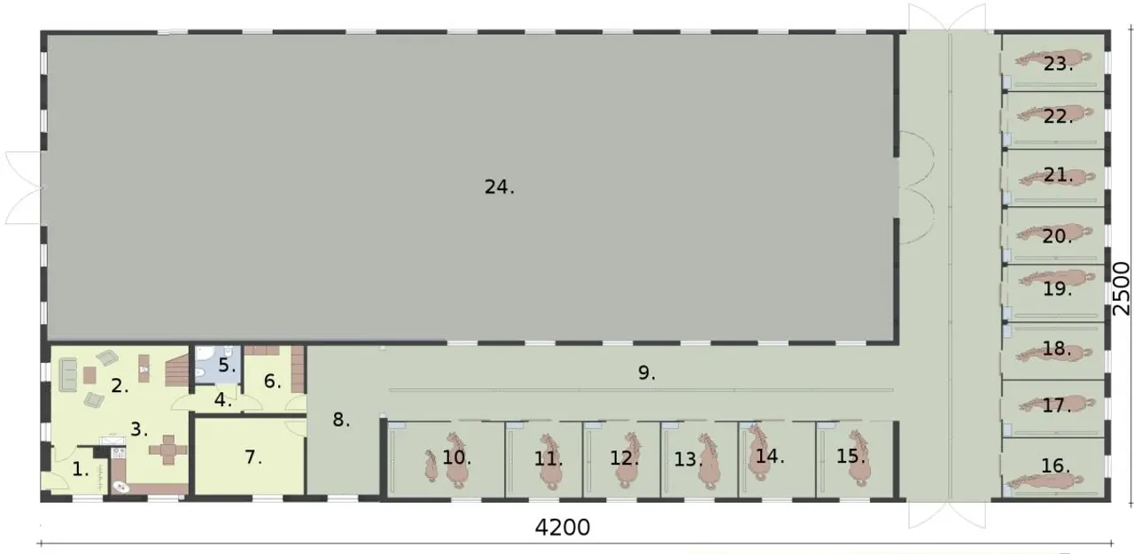 Wypełnij formularz i otrzymaj rysunki w pdf z dokładnymi wymiarami budynku i pomieszczeń (długość, szerokość, wysokość) dla projektu S44 stajnie na 13 boksów z ujeżdżalnią