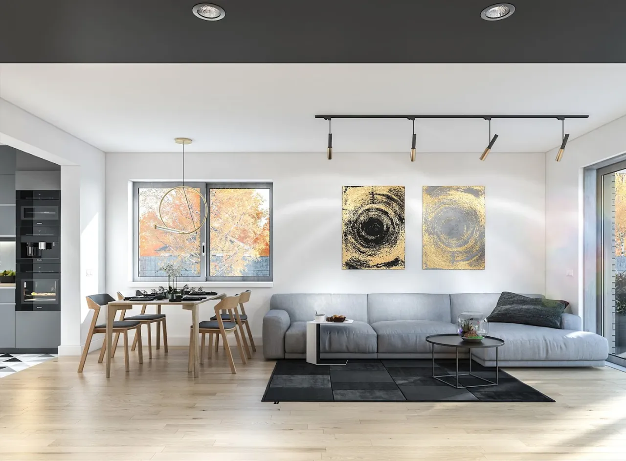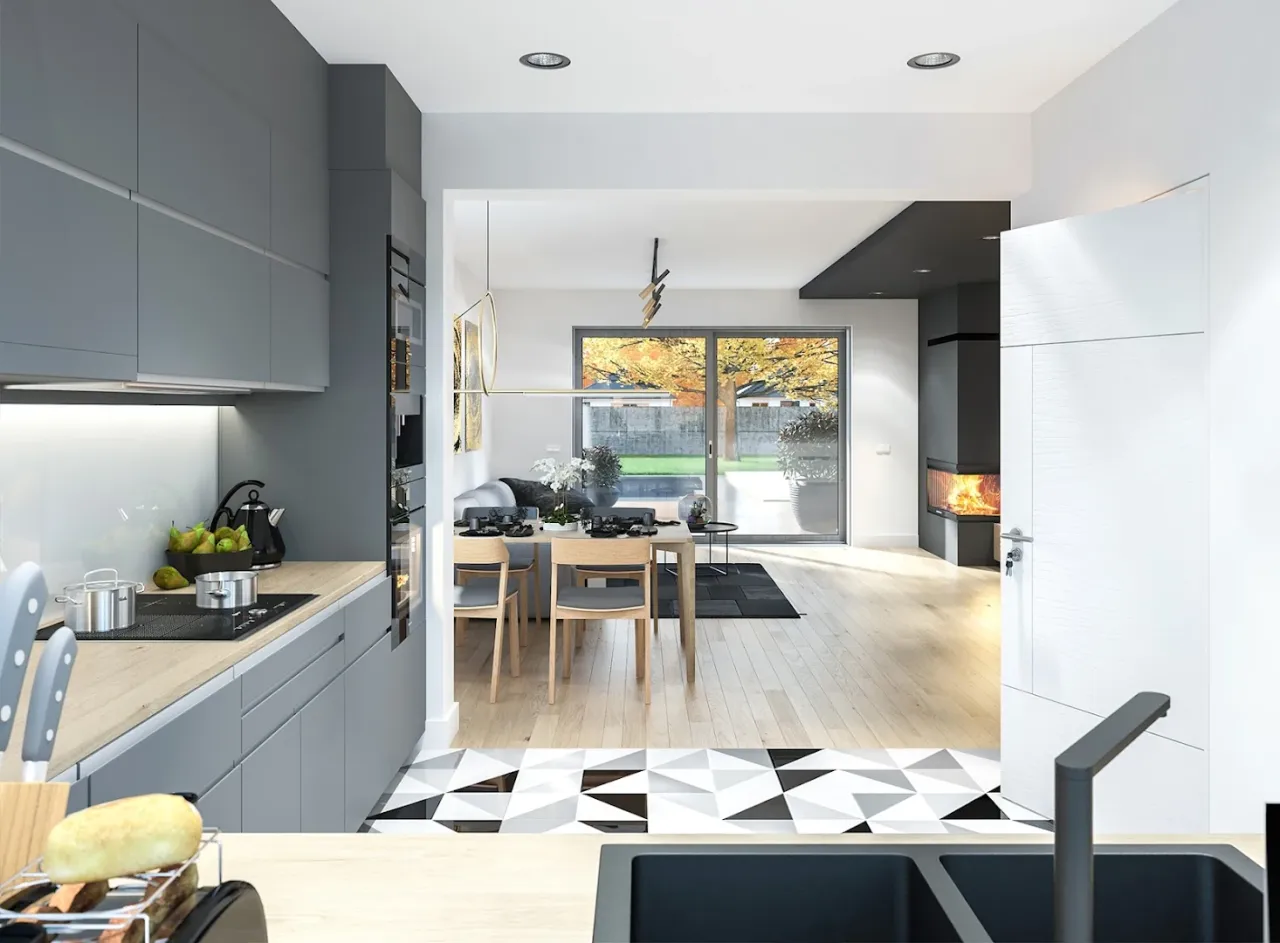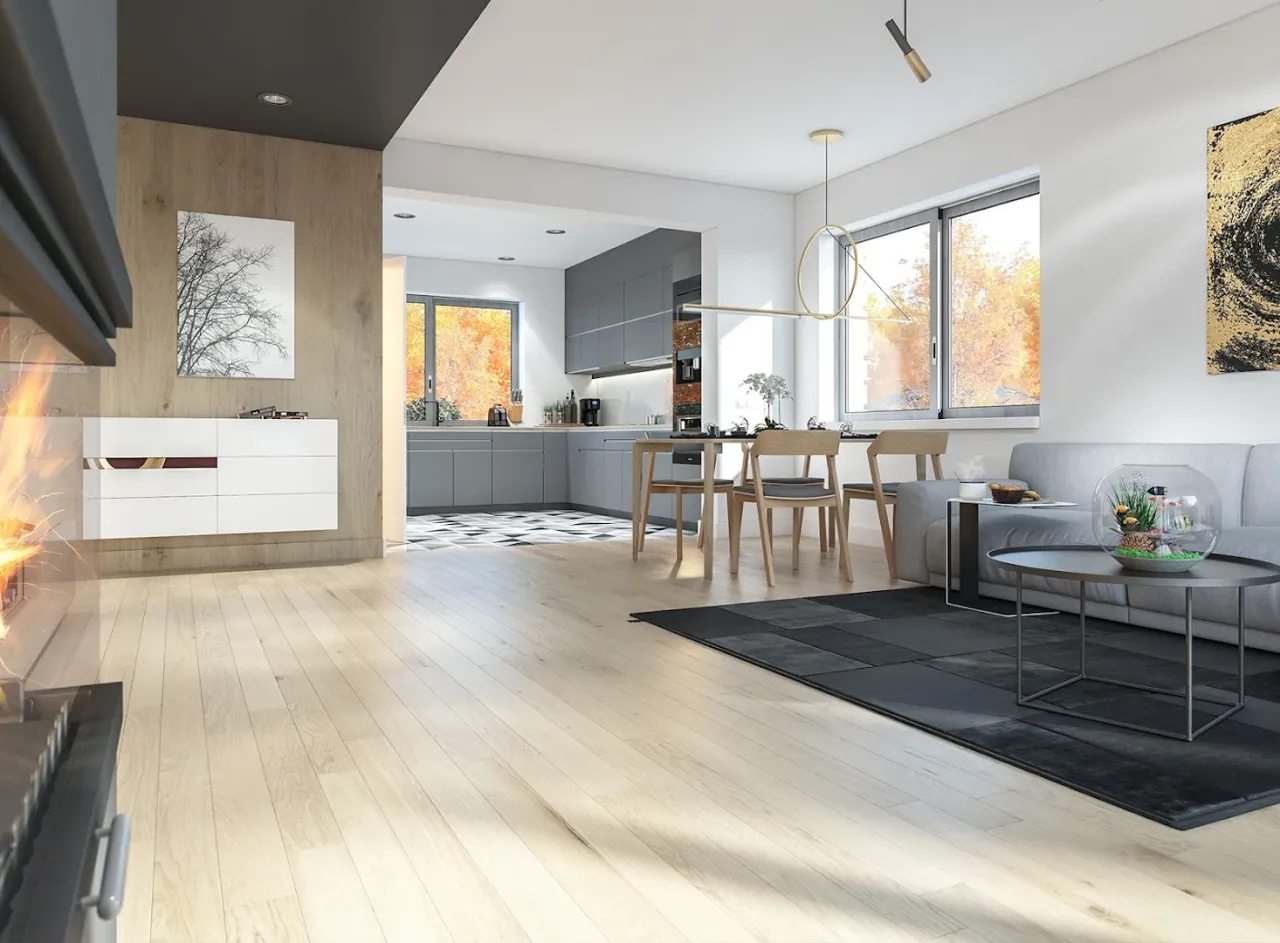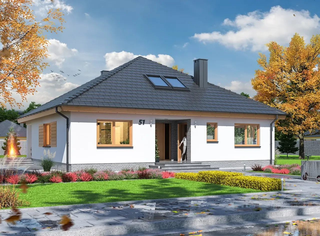 Wnętrze domu jest jasne i łatwe do aranżacji. Przestronny salon z kominkiem stanowi serce rodzinnego życia, a otwarcie na taras sprzyja rekreacji o każdej porze roku. System wentylacji grawitacyjnej, z możliwością rozbudowy o rekuperację, pozwala cieszyć się świeżym powietrzem i mniejszymi rachunkami.