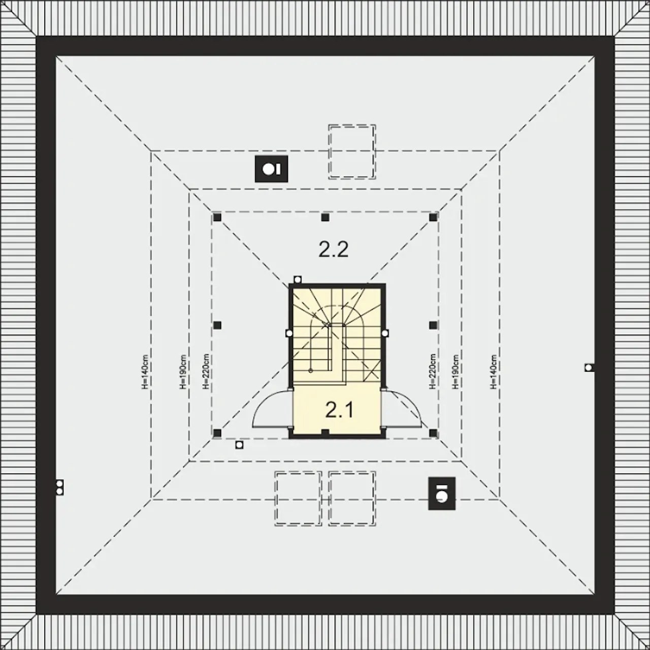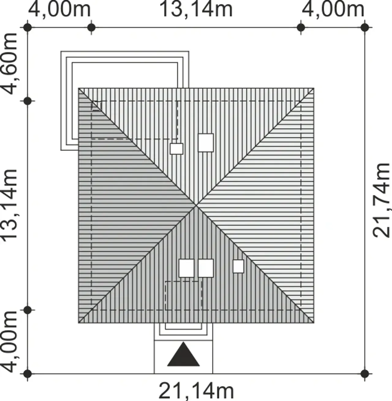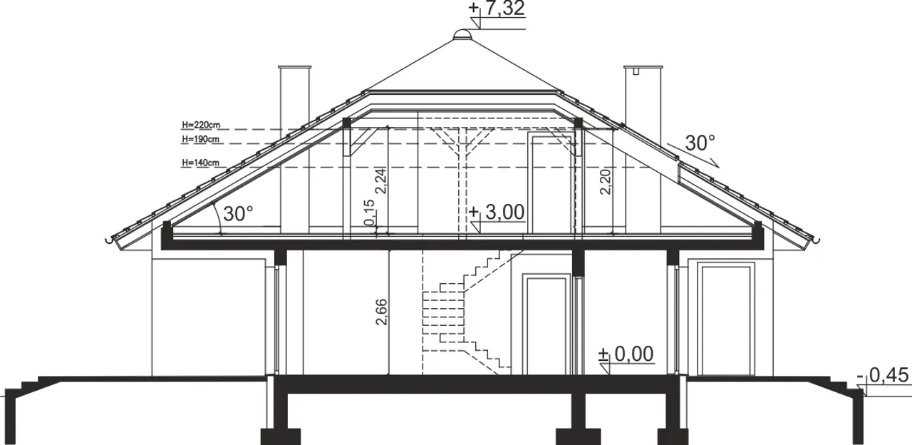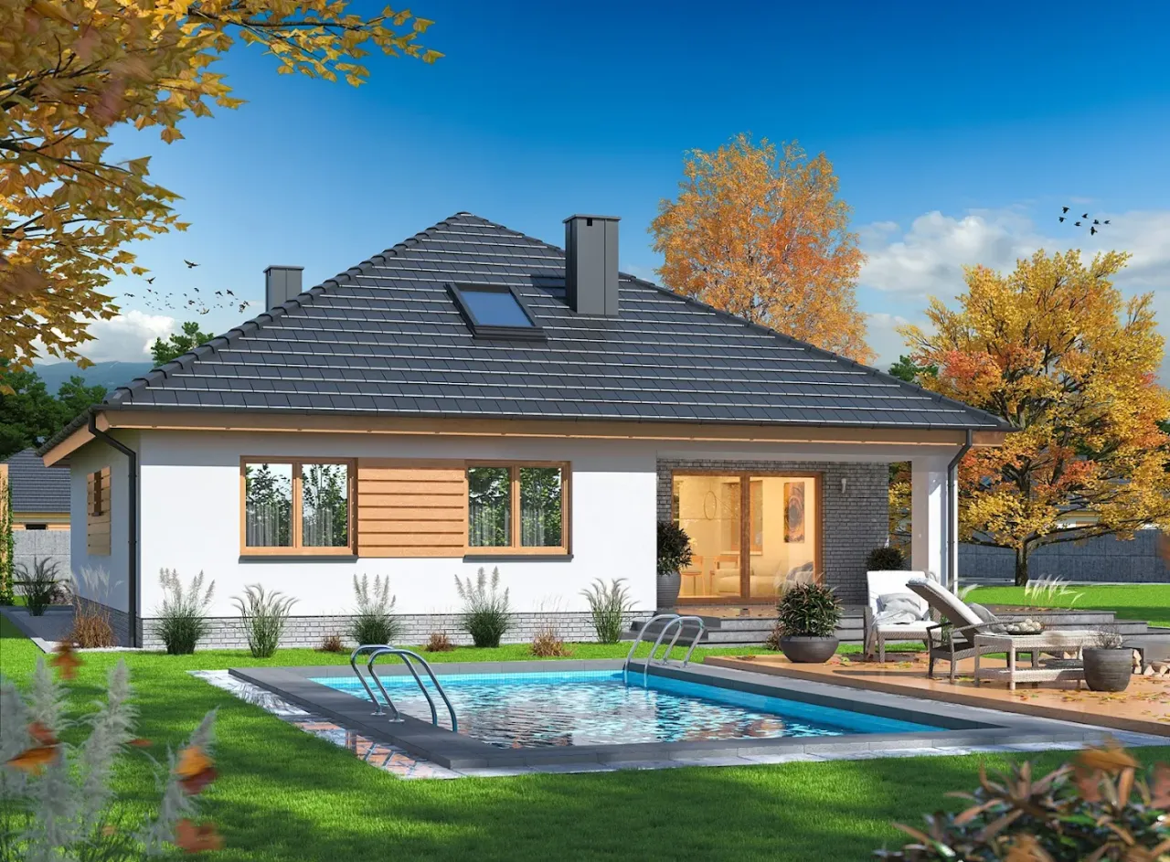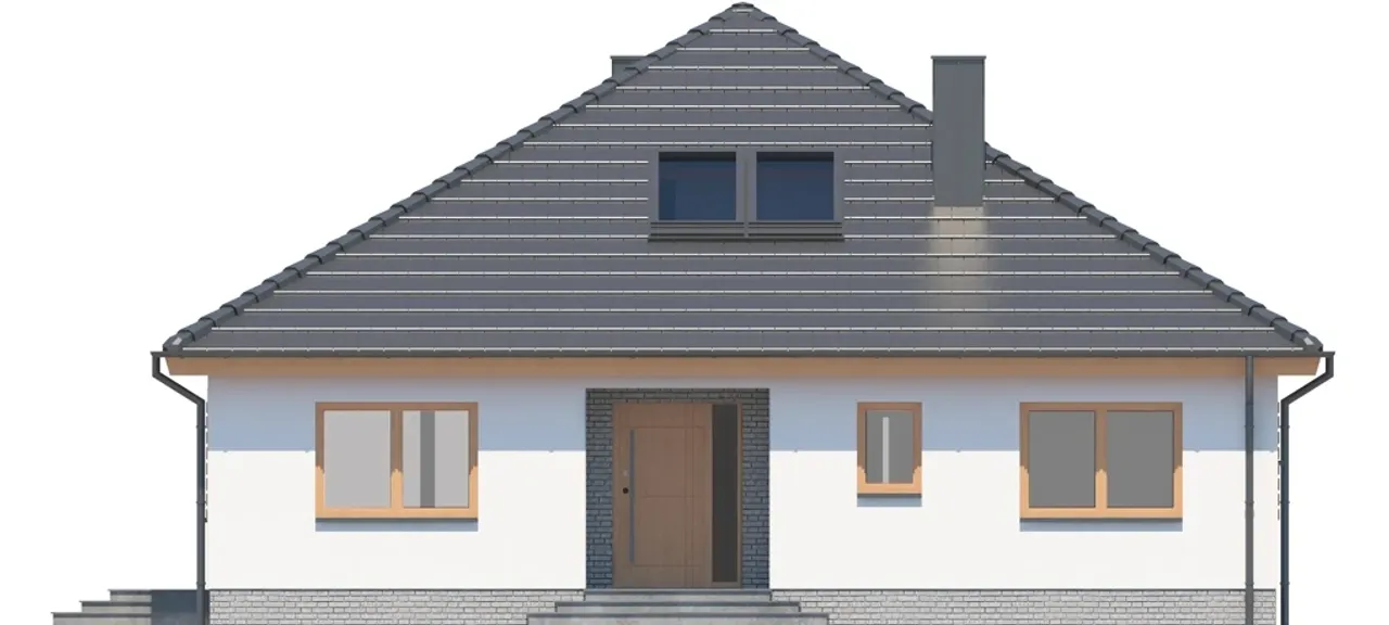 Dom Serafin 3 zbudujesz na solidnych betonowych fundamentach, wykorzystując wytrzymałą konstrukcję żelbetową oraz nowoczesną więźbę dachową z drewna. Dach wykończysz elegancką dachówką cementową lub ceramiczną o kącie nachylenia 30°, idealnie wpisując się w ponadczasową architekturę z wielospadowymi połaciami.