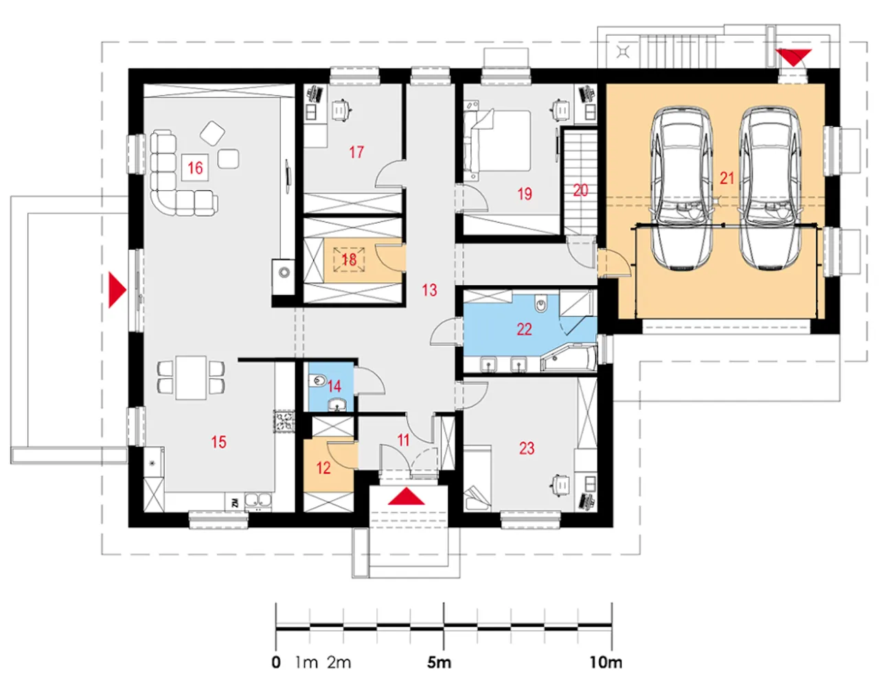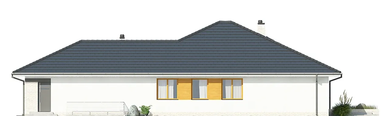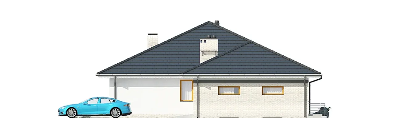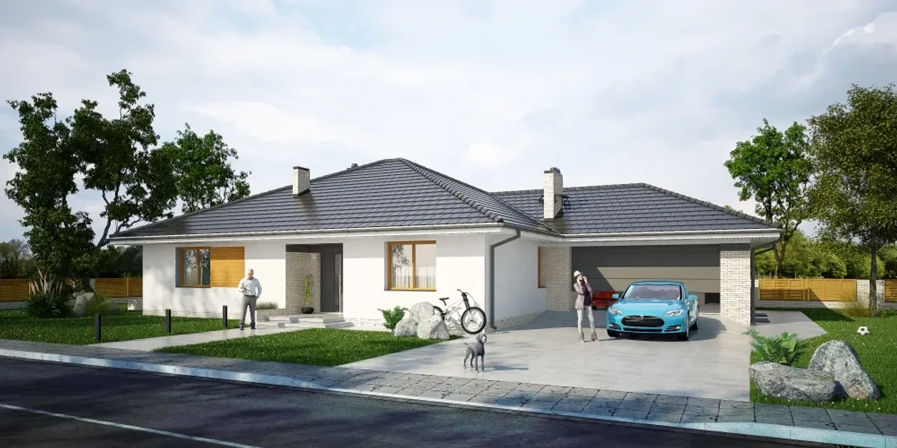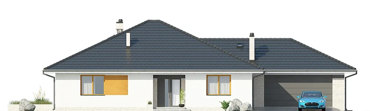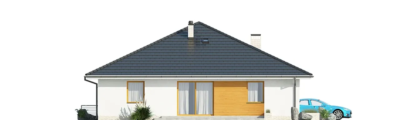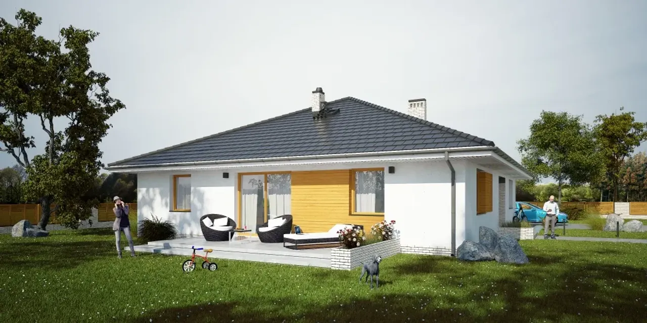 Ten dom parterowy wyróżnia się prostą i elegancką bryłą oraz wygodnym podziałem na strefy domowników. Wnętrze obejmuje cztery przestronne pokoje, w tym salon z jadalnią oraz kominkiem i praktyczną pralnią. Garaż z dwoma stanowiskami pozwala wygodnie parkować dwa samochody, co jest szczególnie ważne dla rodzin z aktywnym trybem życia. Ściany z pustaka ceramicznego LEIER oraz solidny żelbetowy strop gwarantują trwałość oraz wysoką izolację akustyczną i cieplną.