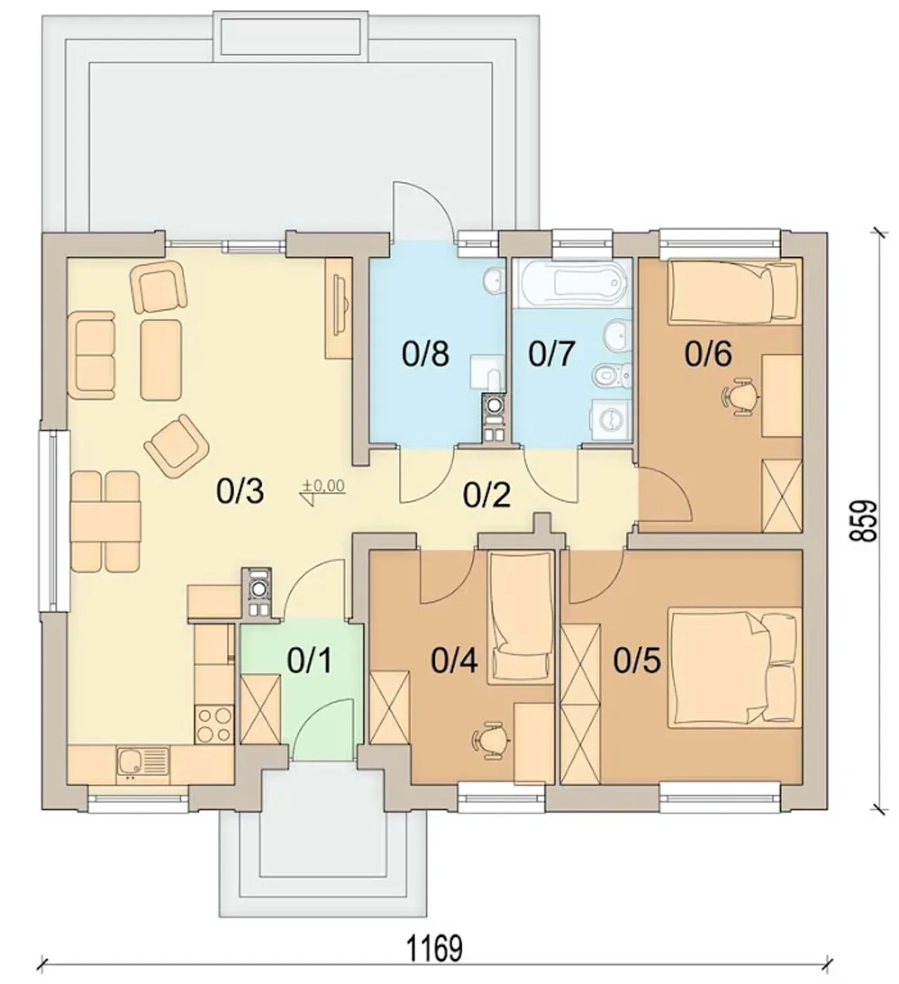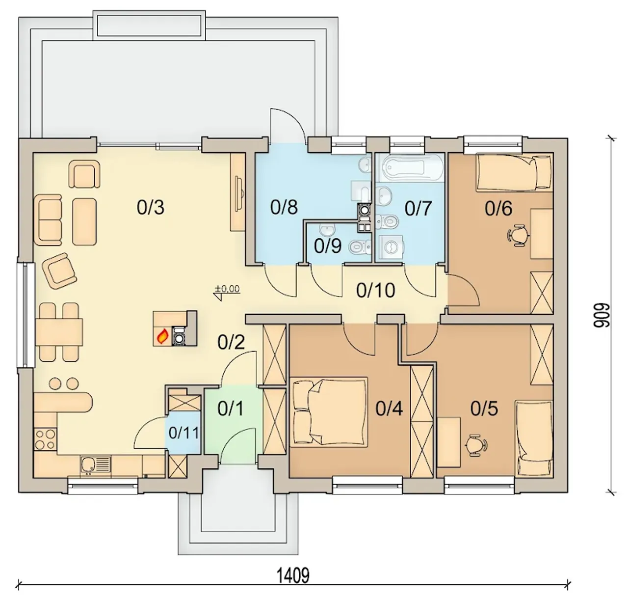 Dom wybudowany według projektu Sezam 4 to synonim wygody dla całej rodziny. Wszystko mieści się na jednej kondygnacji - salon, kuchnia oraz trzy dodatkowe pokoje, pozwalając każdemu z domowników korzystać swobodnie ze swojej strefy. Energooszczędność i stabilność gwarantują ceramiczne ściany, a gęstożebrowy strop doskonale rozkłada obciążenia konstrukcyjne.