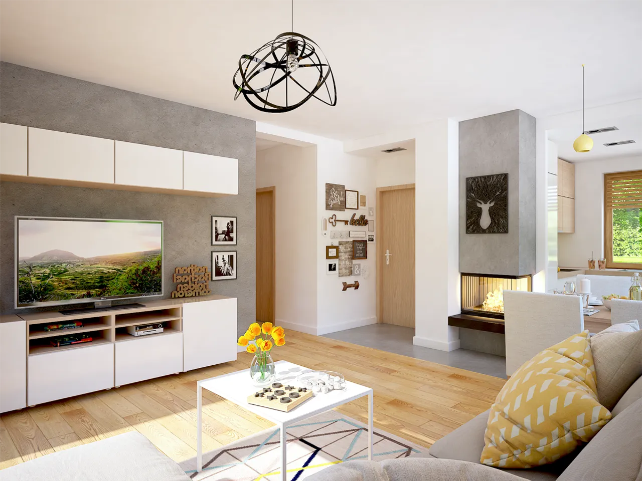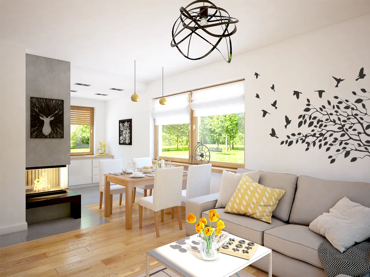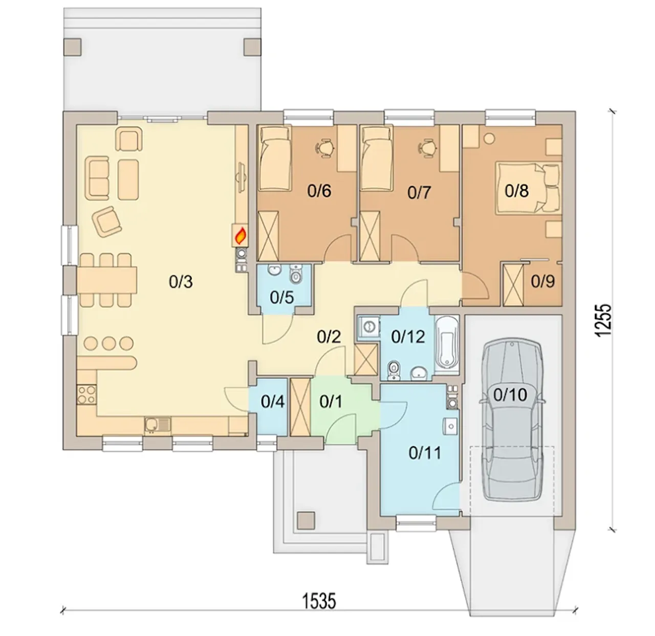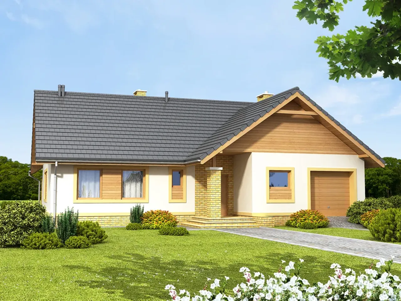 Otwarta przestrzeń dzienna została wzbogacona o kominek - miejsce do wspólnego spędzania wieczorów. Przemyślana kalenica równoległa do drogi doskonale adaptuje się do kształtu większości działek budowlanych. Dach pokryty ceramiką skutecznie chroni budynek przed niekorzystnymi warunkami atmosferycznymi, a wyważona stylistyka utrzymuje atrakcyjność przez długie lata.
