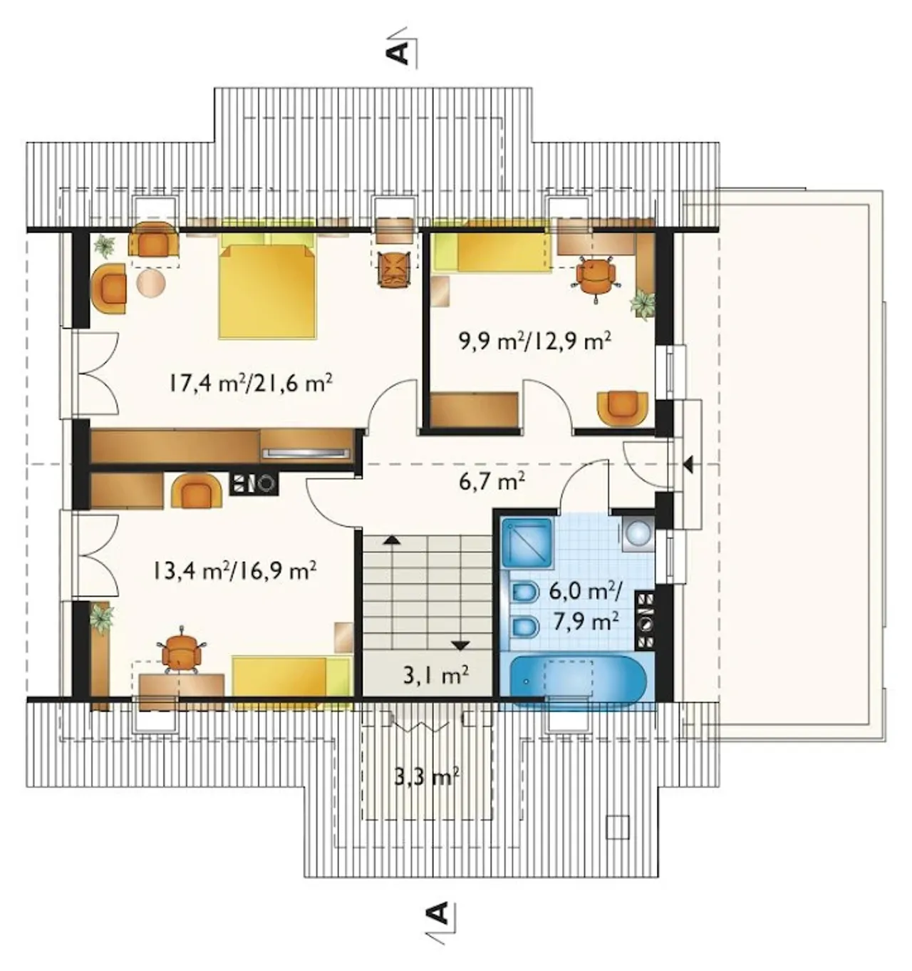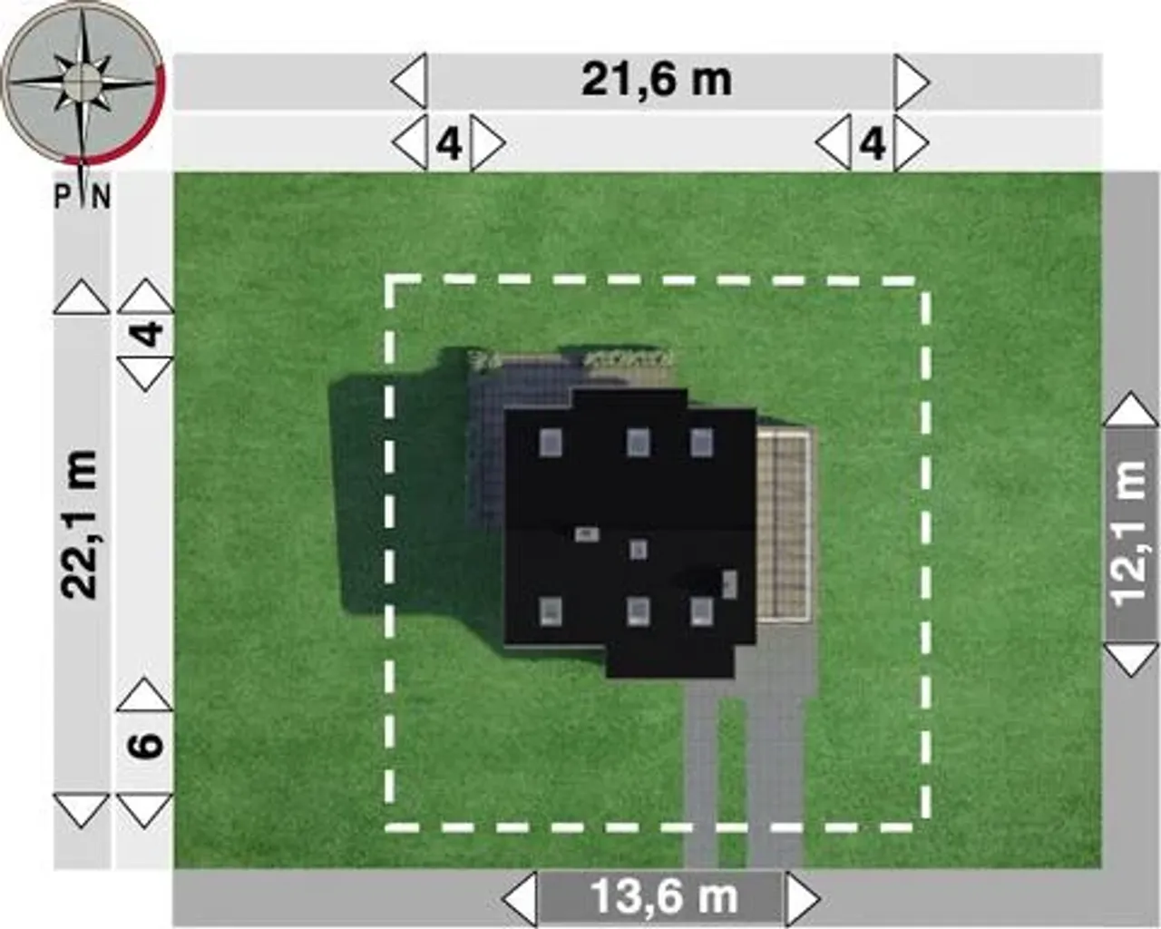 - rzut dachu - ukazuje jego kształt, wymiary, kąt nachylenia połaci, rozmieszczenie okien połaciowych, lukarn, świetlików i rur spustowych, pokazuje rozmieszczenie kominów i informuje o sposobie odwodnienia: rozmieszczeniu i rozmiarach rynien