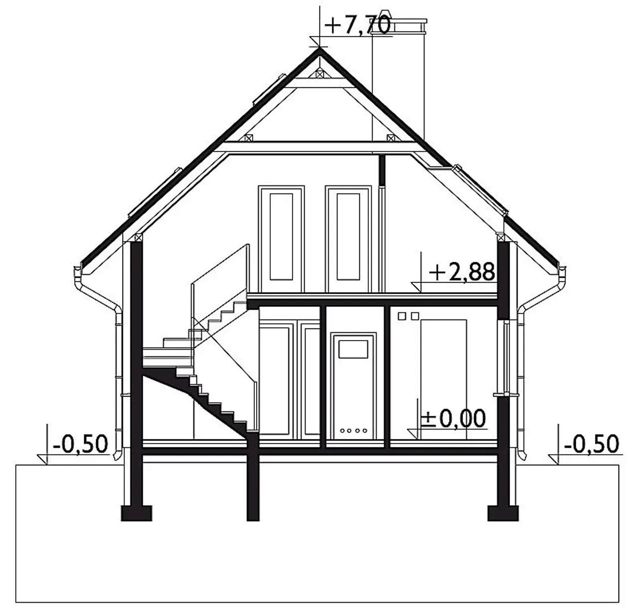 - rzut dachu - ukazuje jego kształt, wymiary, kąt nachylenia połaci, rozmieszczenie okien połaciowych, lukarn, świetlików i rur spustowych, pokazuje rozmieszczenie kominów i informuje o sposobie odwodnienia: rozmieszczeniu i rozmiarach rynien