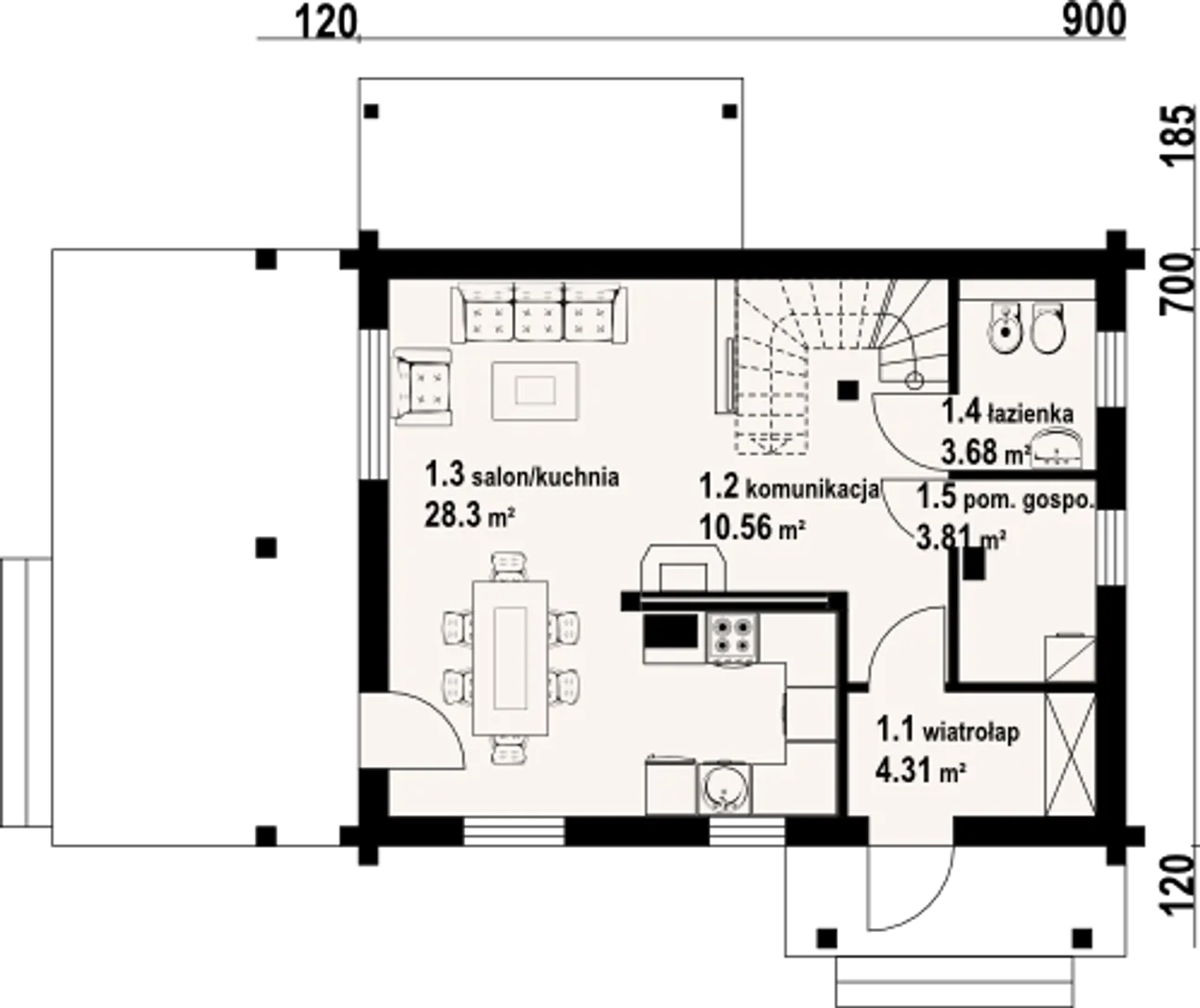 - opisu architektonicznego zawierającego m.in. opis przyjętych rozwiązań, zestawienia powierzchni (użytkowej, zabudowy, netto), kubatury oraz powierzchni poszczególnych pomieszczeń