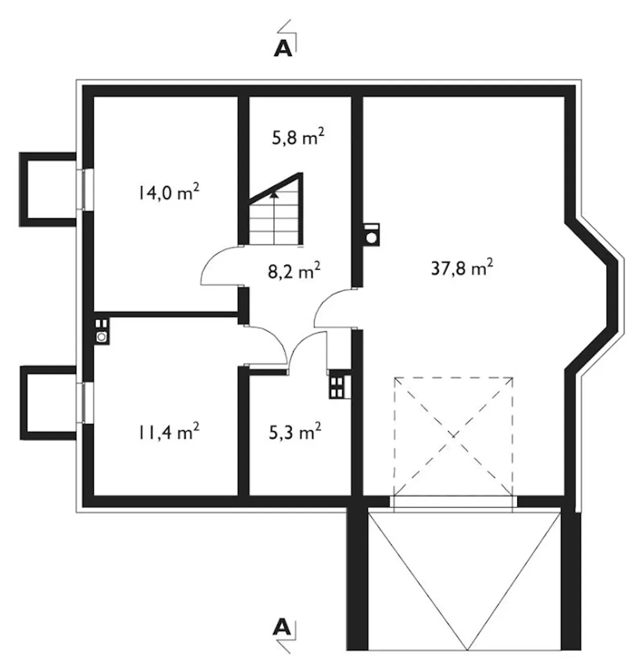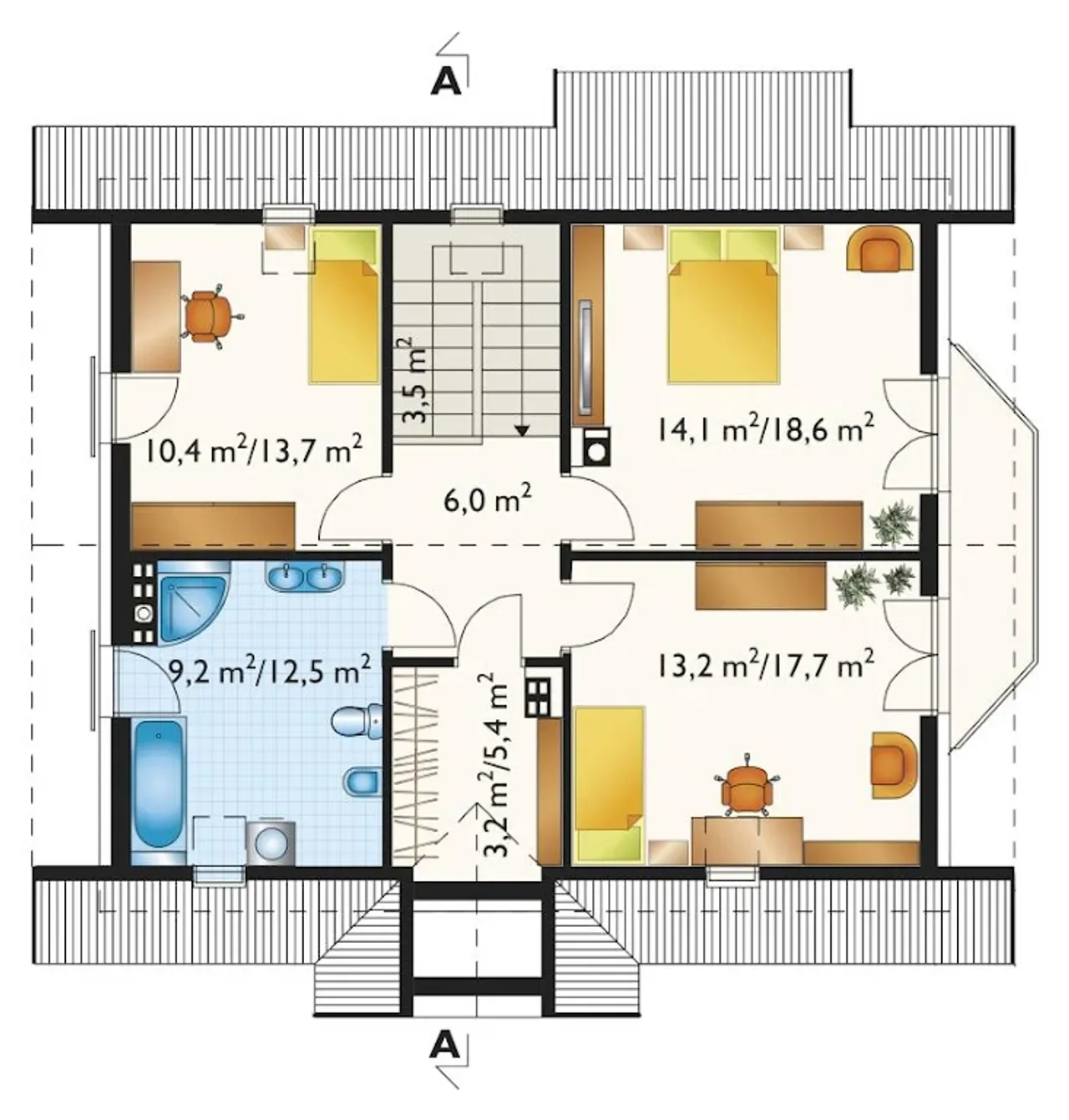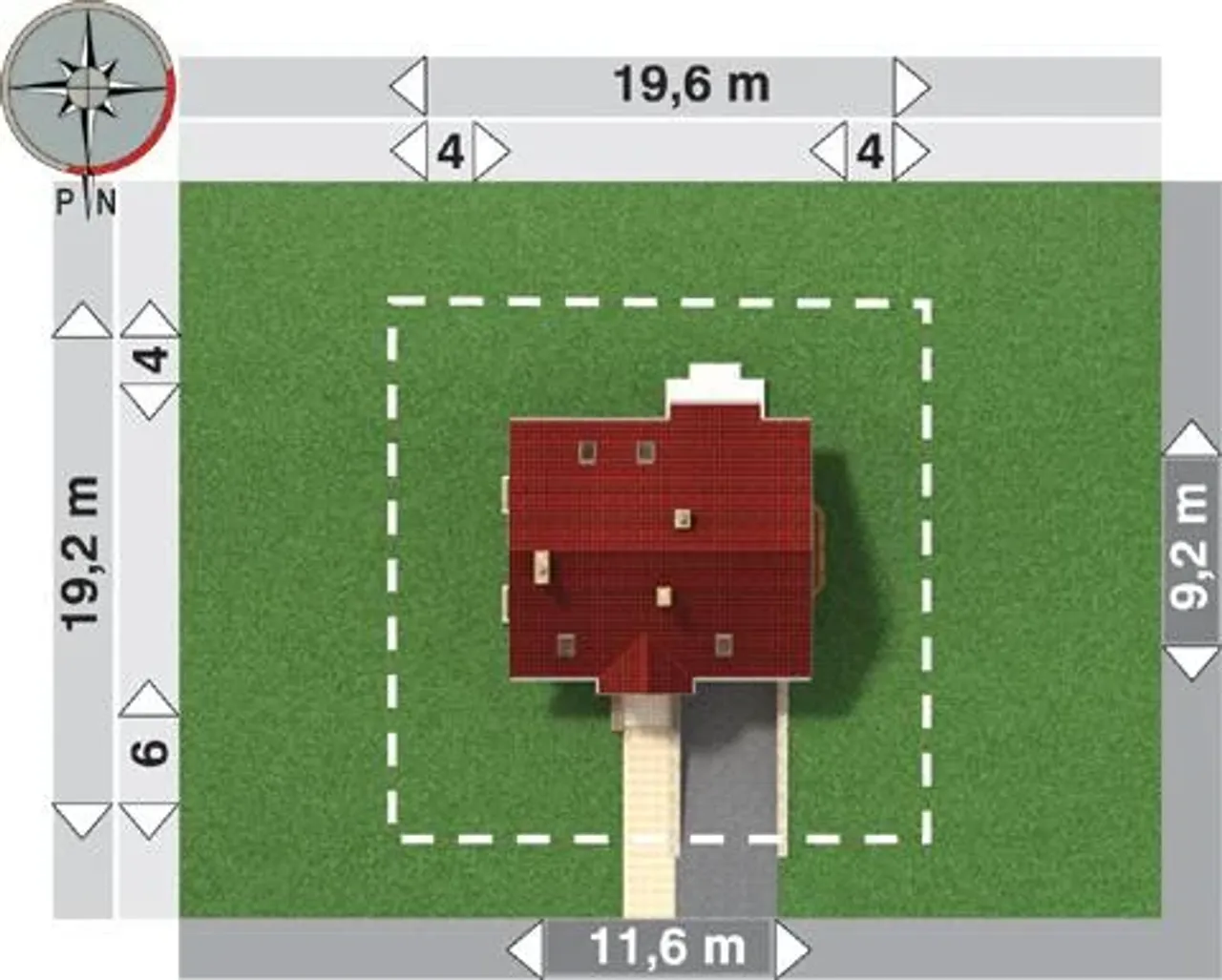 - rzut dachu - ukazuje jego kształt, wymiary, kąt nachylenia połaci, rozmieszczenie okien połaciowych, lukarn, świetlików i rur spustowych, pokazuje rozmieszczenie kominów i informuje o sposobie odwodnienia: rozmieszczeniu i rozmiarach rynien