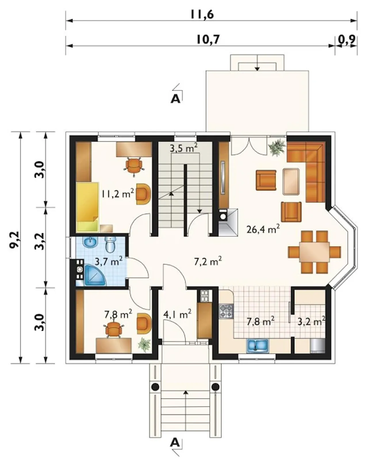 - elewacje - pokazują dokładny wygląd domu od frontu, z tyłu i z boków