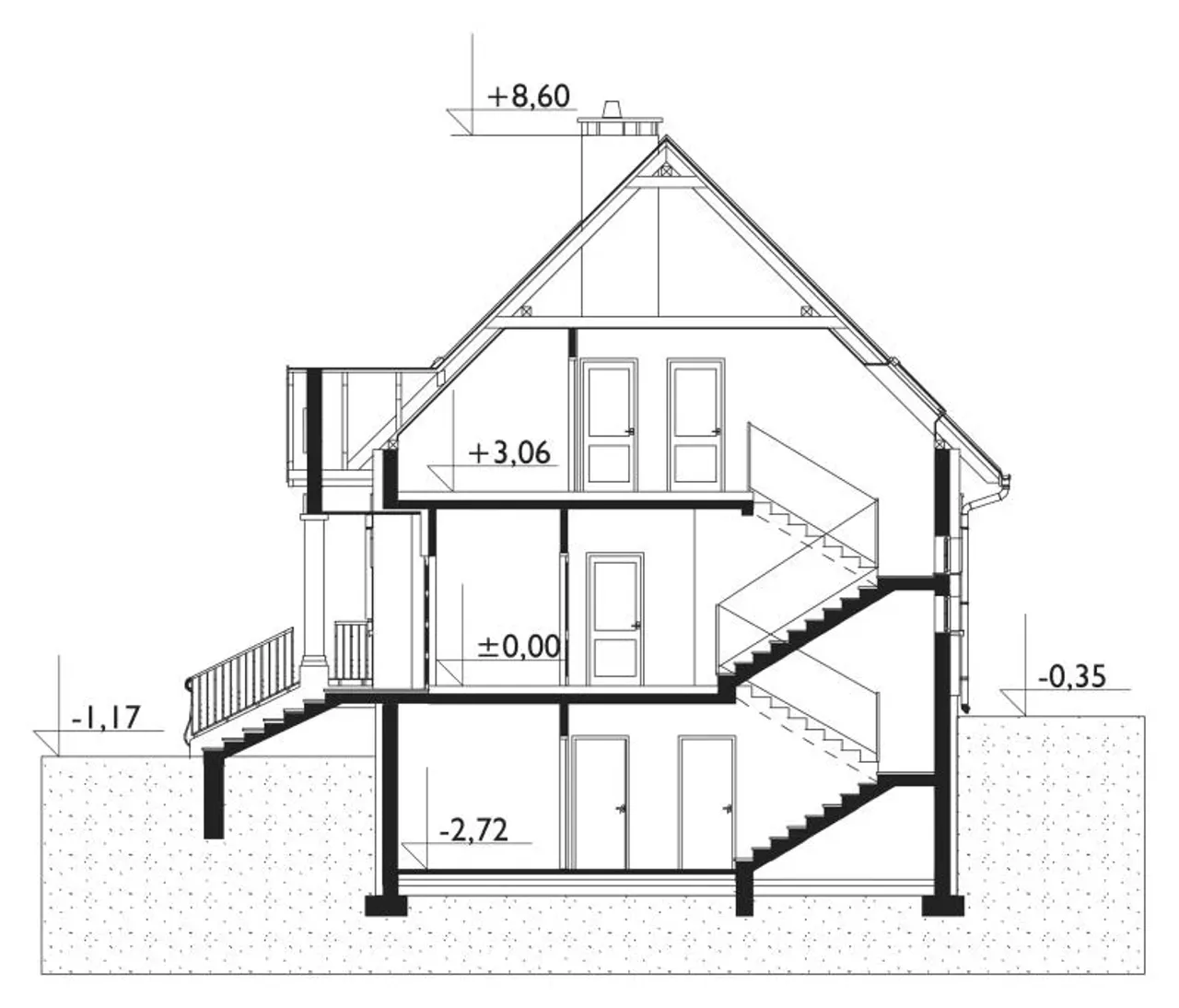 - przekroje - pokazują wszystkie elementy budynku po przecięciu go wzdłuż lub w poprzek od dachu do fundamentów tj. warstwy podłogi, stropów i dachu