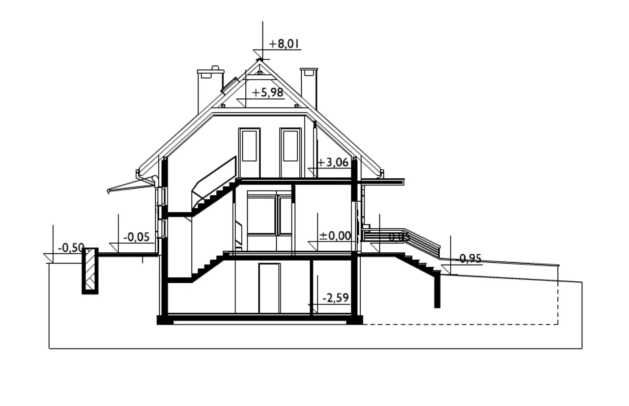 - przekroje - pokazują wszystkie elementy budynku po przecięciu go wzdłuż lub w poprzek od dachu do fundamentów tj. warstwy podłogi, stropów i dachu