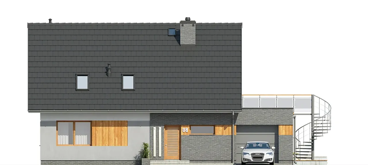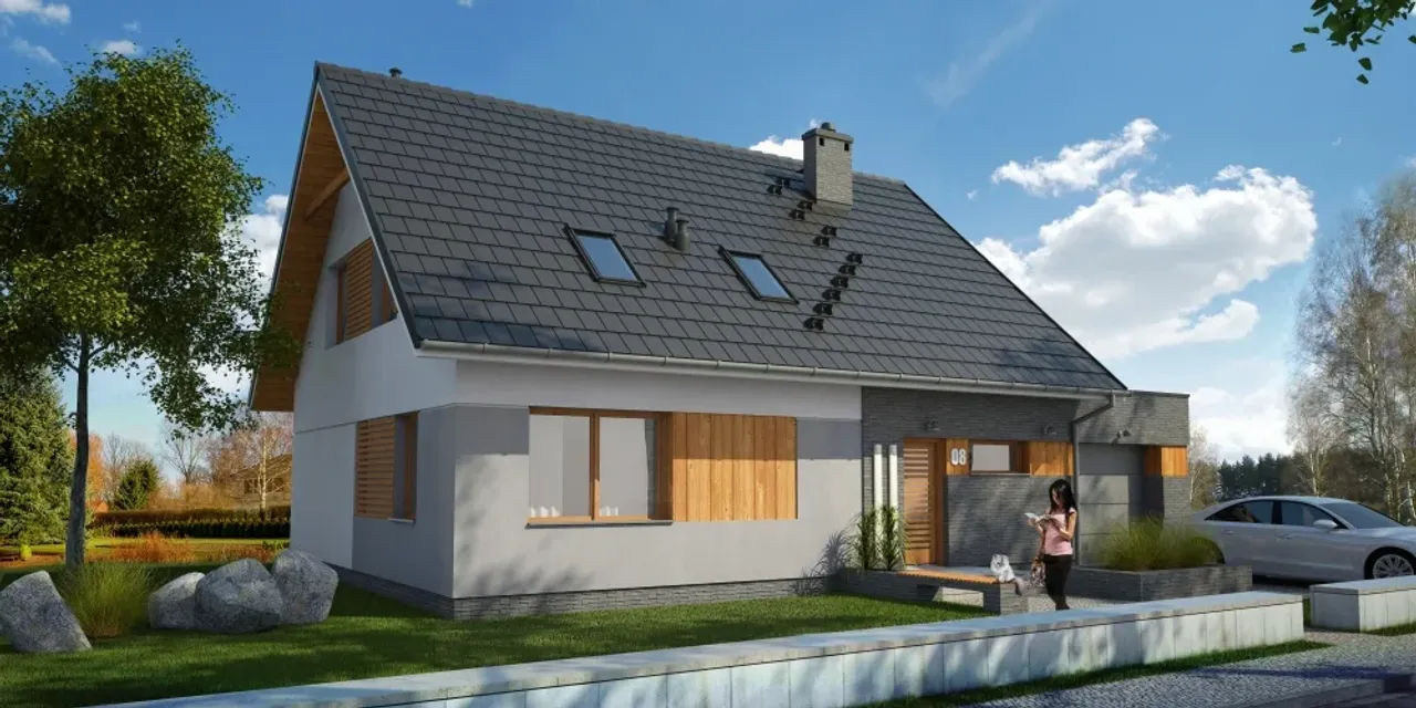 Odkryj nowoczesny projekt domu parterowego z poddaszem Spiralis I G1 - przemyślaną propozycję dla rodzin ceniących wygodę, styl i funkcjonalność. Przestrzeń tego domu zachwyca prostą bryłą, efektownym wykuszem i garażem wkomponowanym w bryłę budynku, gwarantując wygodne codzienne użytkowanie.