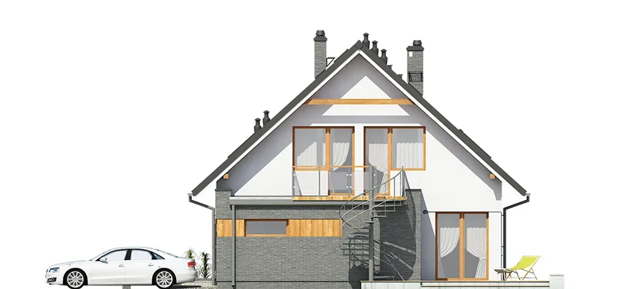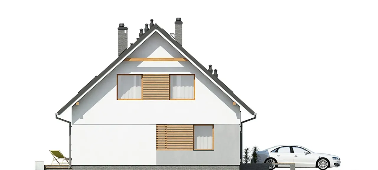 Poddasze użytkowe umożliwia zorganizowanie nawet siedmiu funkcjonalnych pokoi. Kalenica równoległa do drogi ułatwia usytuowanie domu na różnych działkach. Dzięki wykuszowi główny salon zyskuje efektowną, jasną przestrzeń, a kominek stwarza przyjemną atmosferę w chłodne wieczory. Jednostanowiskowy garaż przyklejony do domu to gwarancja wygody dla kierowców niezależnie od pogody.