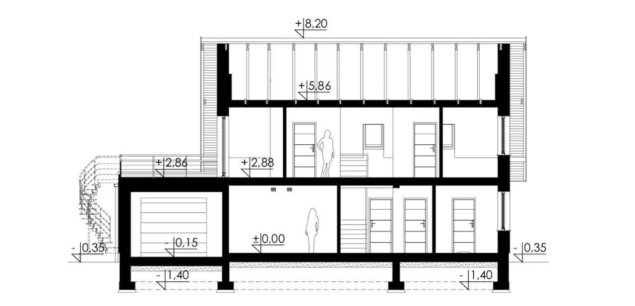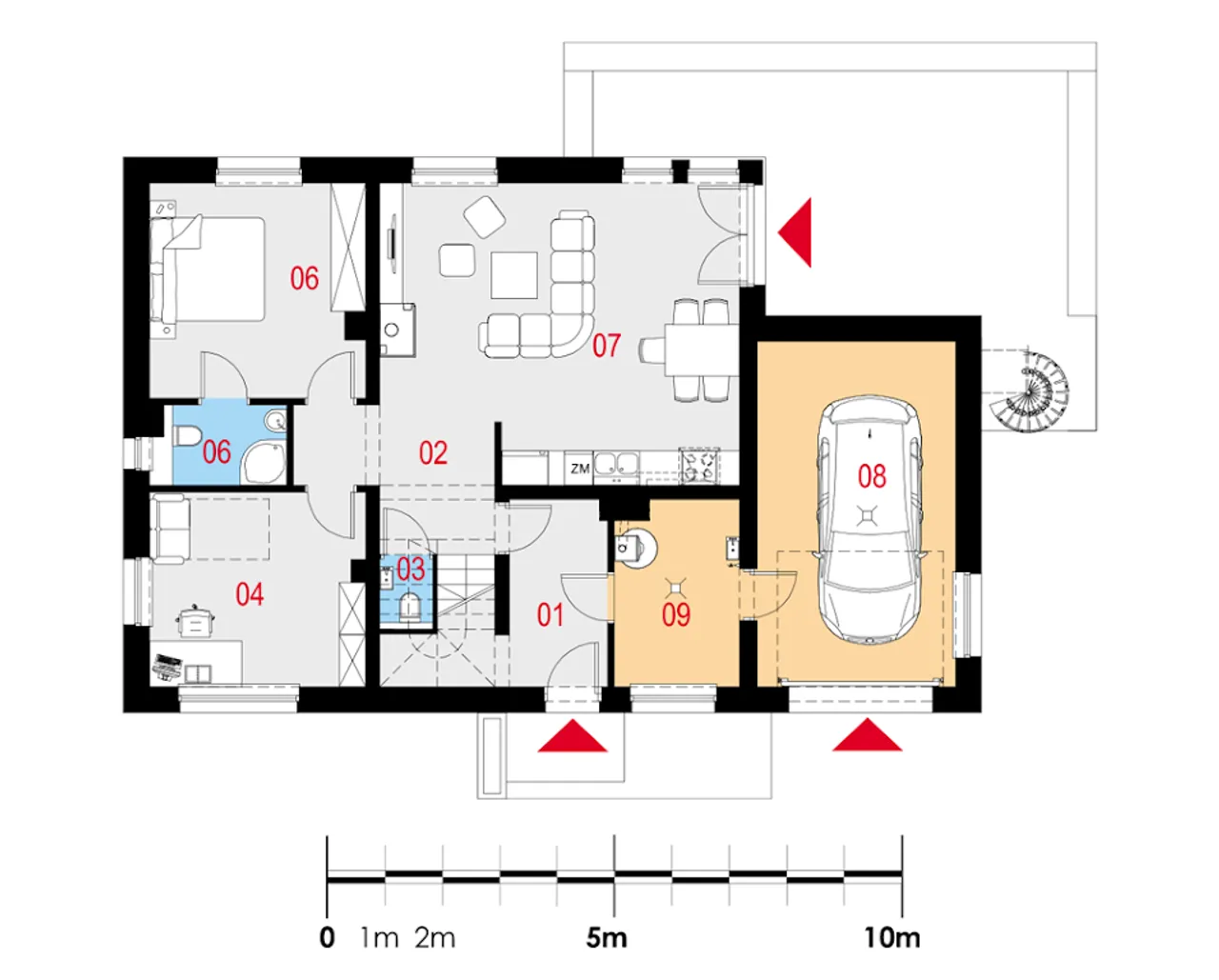 Dom jednorodzinny Spiralis I G1 to połączenie nowoczesnej technologii z praktycznymi rozwiązaniami dla wymagających rodzin. Konstrukcja murowana z pustaków ceramicznych marki LEIER oraz ocieplenie styropianem Termo Organika pozwala ograniczyć straty ciepła i podnieść standard energooszczędności. Żelbetowy strop oraz zabiegowe schody gwarantują stabilność każdego poziomu. Okna i drzwi PVC, rolety zewnętrzne oraz segmentowa brama garażowa zabezpieczają wnętrze oraz podnoszą komfort mieszkańców.