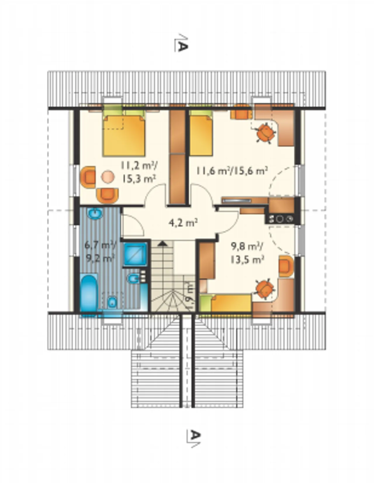 - rzut dachu - ukazuje jego kształt, wymiary, kąt nachylenia połaci, rozmieszczenie okien połaciowych, lukarn, świetlików i rur spustowych, pokazuje rozmieszczenie kominów i informuje o sposobie odwodnienia: rozmieszczeniu i rozmiarach rynien