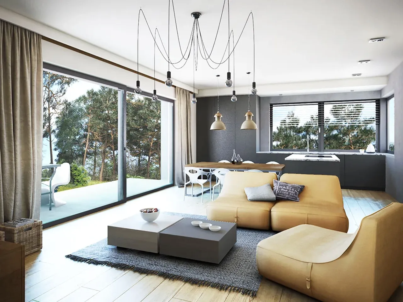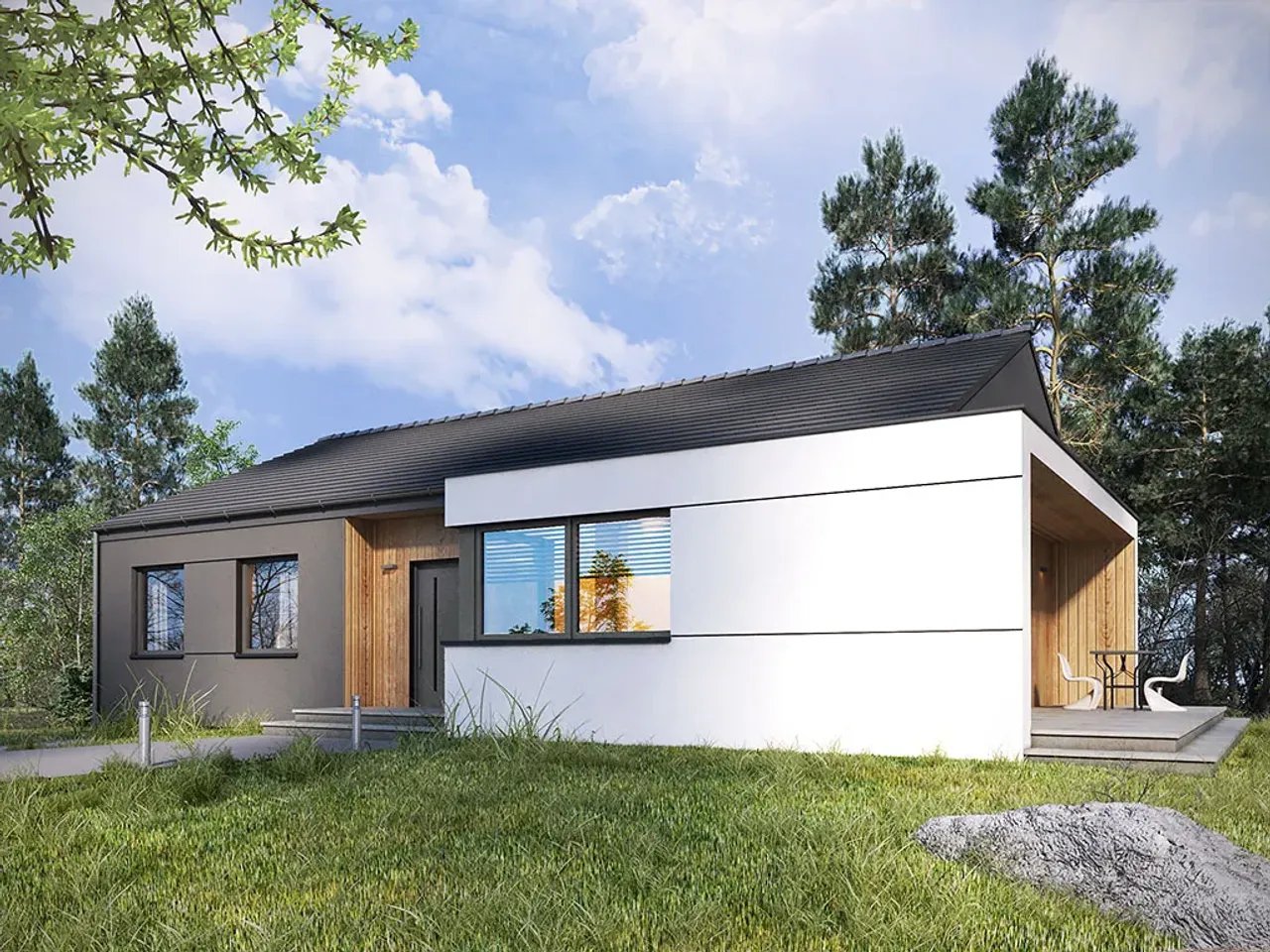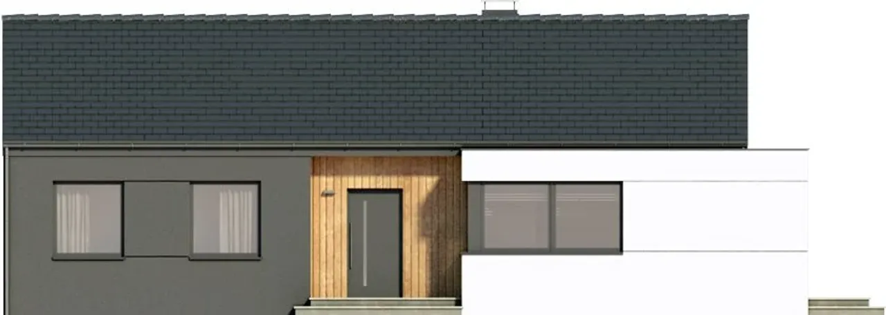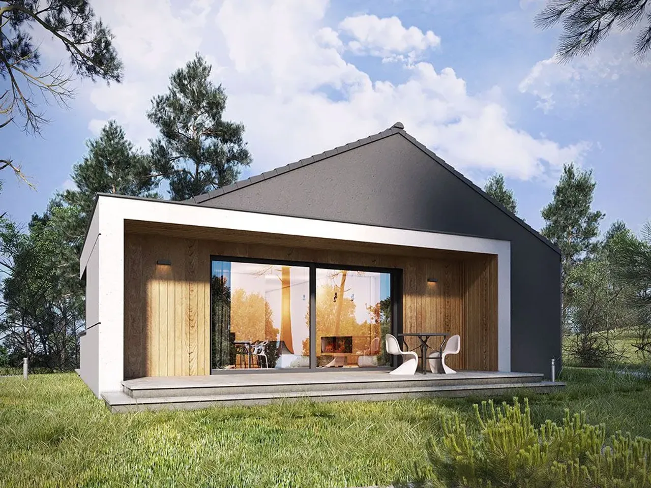 Projekt domu parterowego Studio 57 charakteryzuje się nowoczesnym designem i brakiem garażu. Charakterystyczną cechą jest ramowa konstrukcja nad tarasem zintegrowanym z salonem. Dzięki umiejscowieniu okien w dziennym pokoju na bocznej ścianie, dom można umiejscowić na działce z dojazdem od południa.