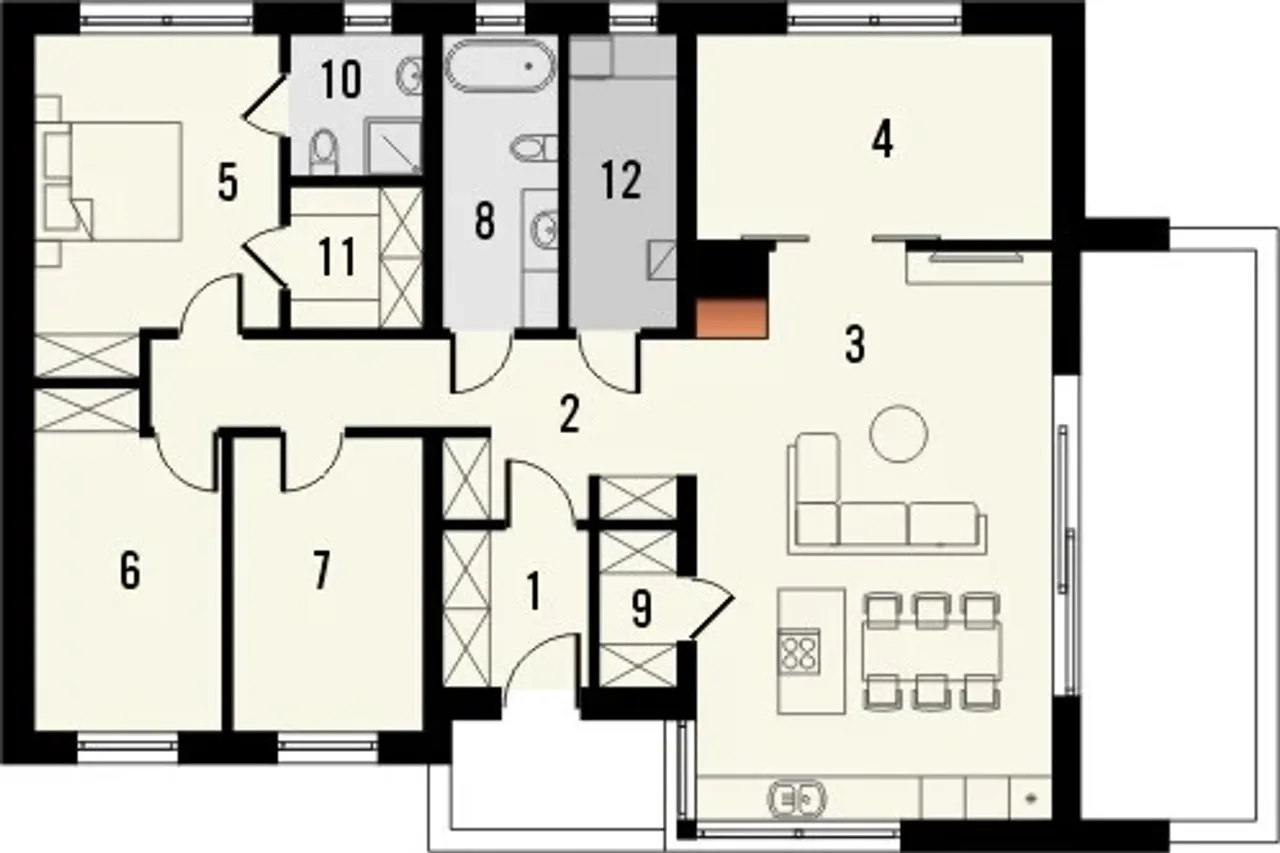 Program funkcjonalny parterowego domu obejmuje trzy sypialnie oraz dodatkowy pokój dostępny z dziennego. Może on pełnić różne funkcje, np. jako domowe kino lub gabinet. Przestronna strefa dzienna posiada otwarty plan z kuchnią wyposażoną w wyspę oraz duży stół jadalniany. Wnętrze zostało zaprojektowane z myślą o praktycznym użytkowaniu, oferując miejsce na wbudowane szafy, wydzieloną garderobę oraz spiżarnię.