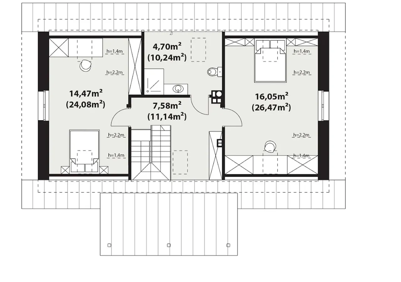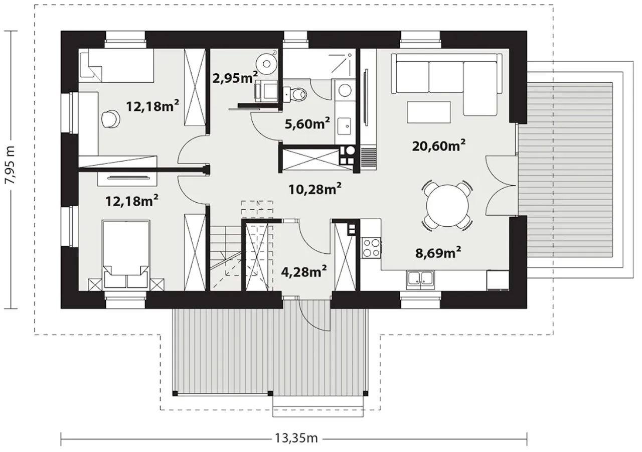 Konstrukcja bez garażu, z atrakcyjnym dachem dwuspadowym o kącie nachylenia 40°, to propozycja dla osób, które stawiają na prostotę, klasyczną estetykę i funkcjonalność. Poznaj projekt, który ułatwia energooszczędne ogrzewanie i wprowadza wyjątkową atmosferę dzięki kominkowi w salonie.