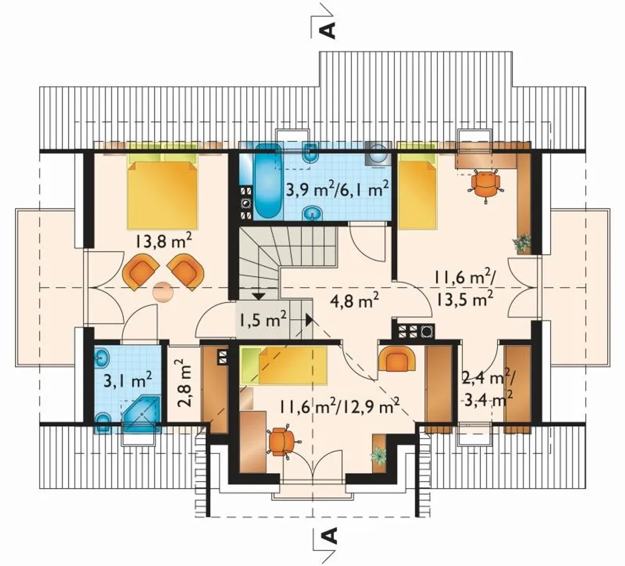 - rzut dachu - ukazuje jego kształt, wymiary, kąt nachylenia połaci, rozmieszczenie okien połaciowych, lukarn, świetlików i rur spustowych, pokazuje rozmieszczenie kominów i informuje o sposobie odwodnienia: rozmieszczeniu i rozmiarach rynien
