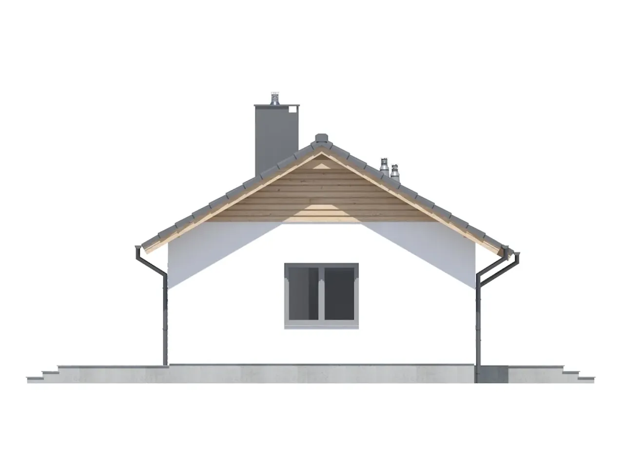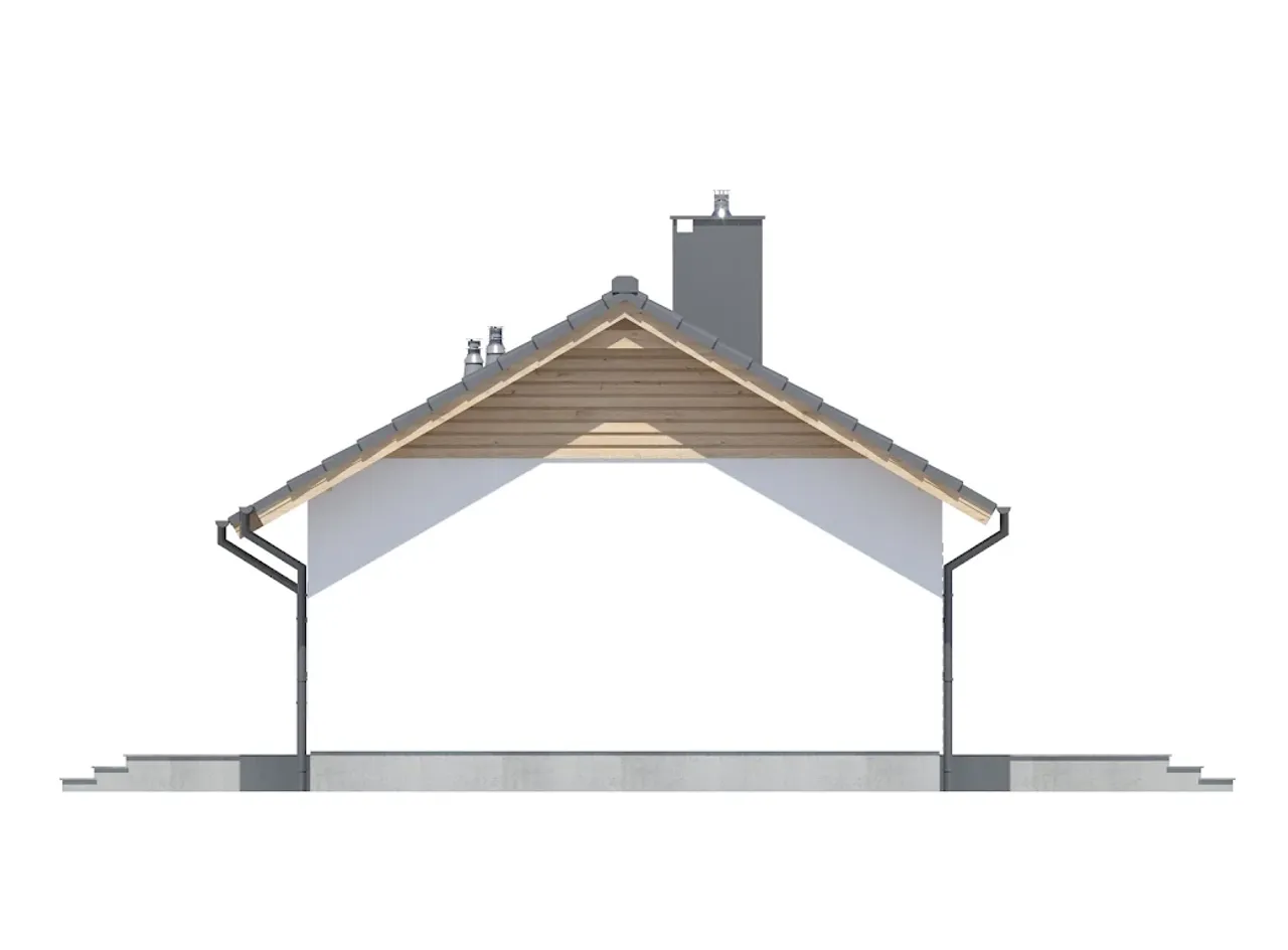 Tradycyjny, solidny drewniany strop i więźba dachowa gwarantują trwałość oraz łatwość wykonania. Wnętrze zostało zaplanowane tak, aby każdy pokój miał dostęp do naturalnego światła i tworzył przytulną domową atmosferę. Tania w budowie i użytkowaniu, a jednocześnie dająca wygodę przestrzeń dzienna z kominkiem spełni oczekiwania rodzin oraz osób ceniących praktyczne rozwiązania. Kalenica równoległa do drogi ułatwia lokalizację budynku na działce o różnym kształcie.