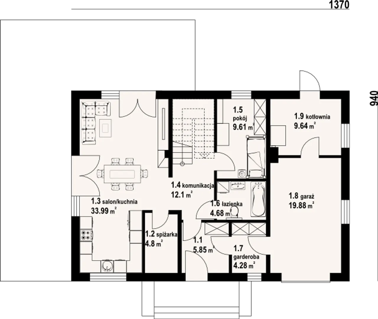 Wypełnij formularz i otrzymaj rysunki w pdf z dokładnymi wymiarami budynku i pomieszczeń (długość, szerokość, wysokość) dla projektu Tarnowo 1g