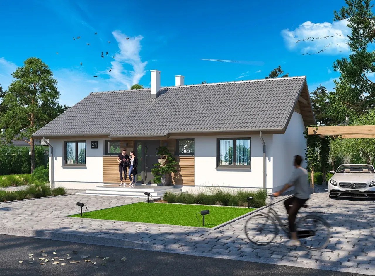 Parterowy układ oraz klasyczna, prosta bryła sprawiają, że budynek świetnie wpisze się w każdą okolicę, zarówno miejską, jak i podmiejską. Jasne wnętrza, wygodny taras oraz otwarty kominek tworzą atmosferę ciepła i odpoczynku - miejsce, w którym można poczuć się naprawdę swobodnie.