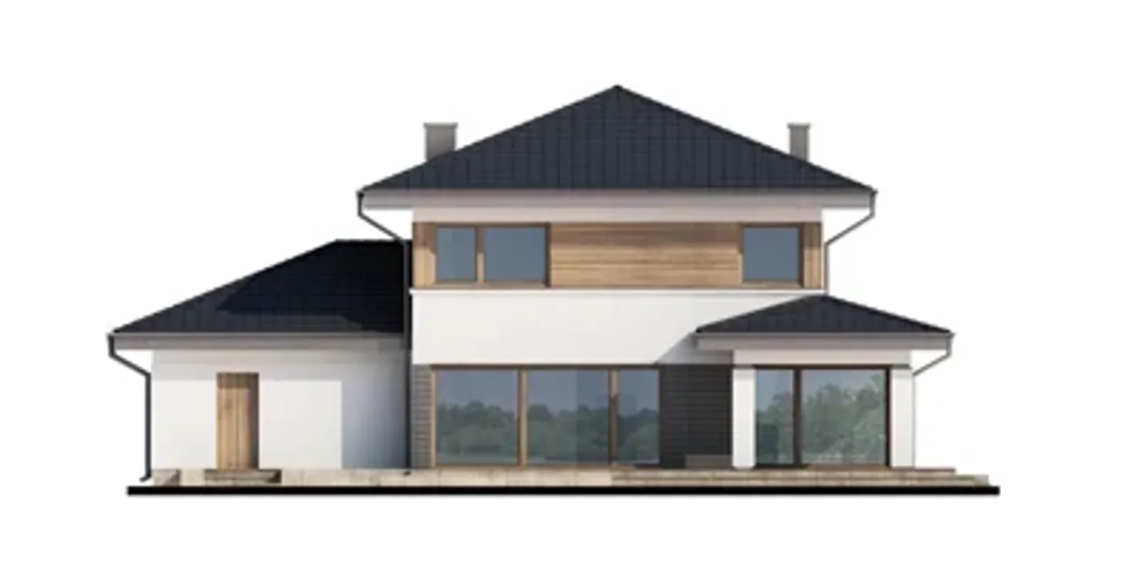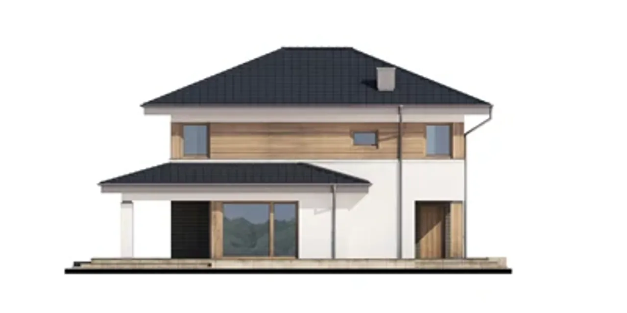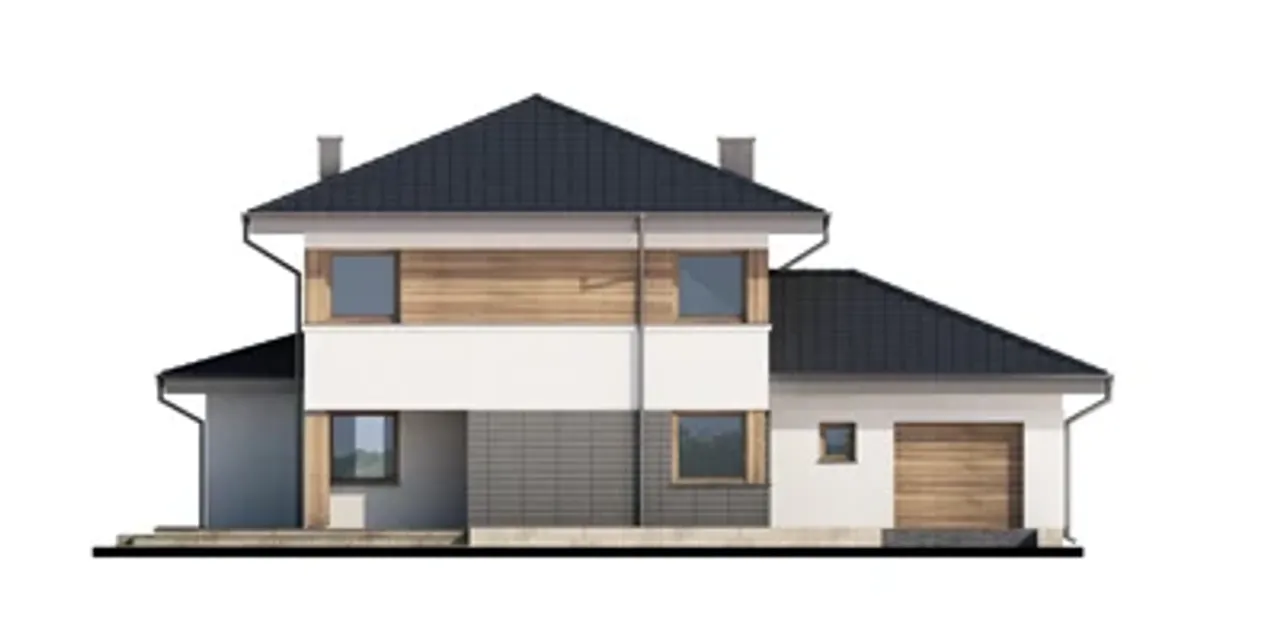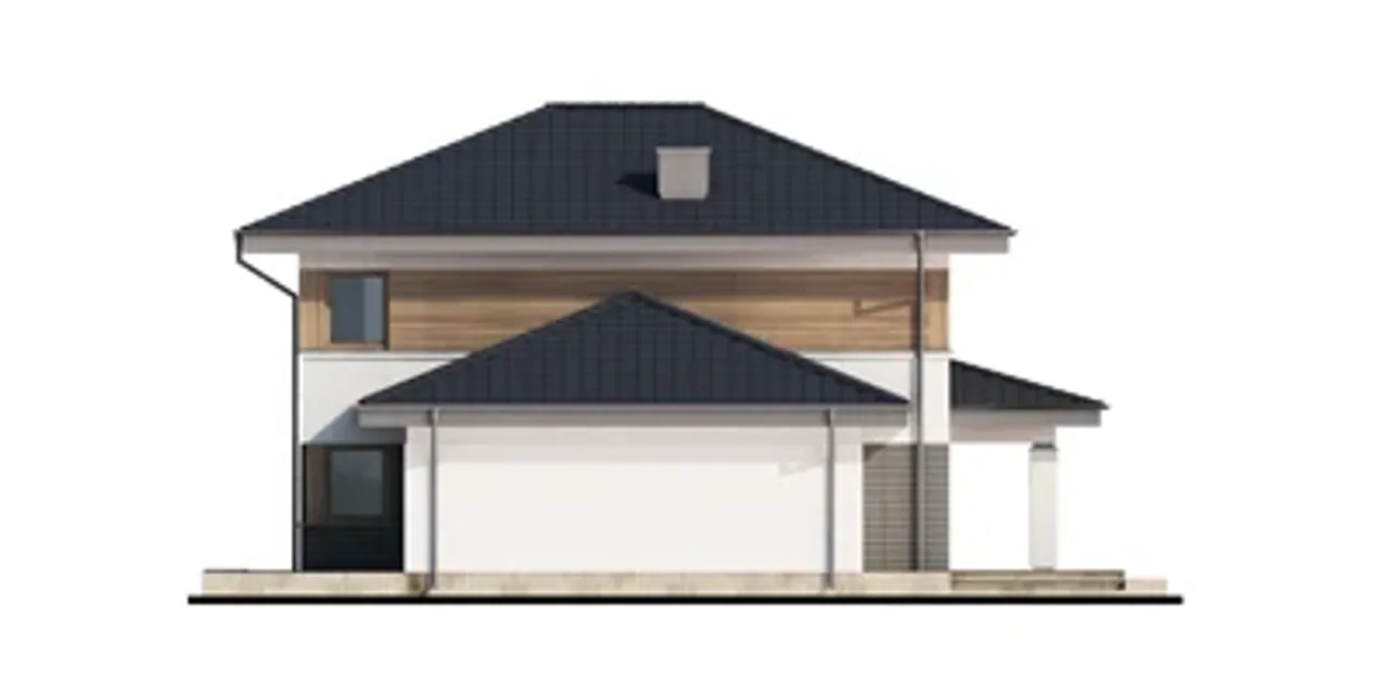 Projekt domu Telmun to piętrowy dom pokryty dachem wielospadowym, budynek charakteryzuje się prostymi liniami oraz nowoczesnym wyglądem. Od strony frontowej znajdują się zadaszone drzwi frontowe oraz wjazd do garażu jednostanowiskowego, z którego możemy dostać się do wewnątrz budynku. W projekcie domu Telmun salon oraz jadalnia zostały bardzo dobrze doświetlone, a to za sprawą dużych przeszkleń, dodatkowo z obydwóch pomieszczeń możemy przejść na częściowo zadaszony taras,