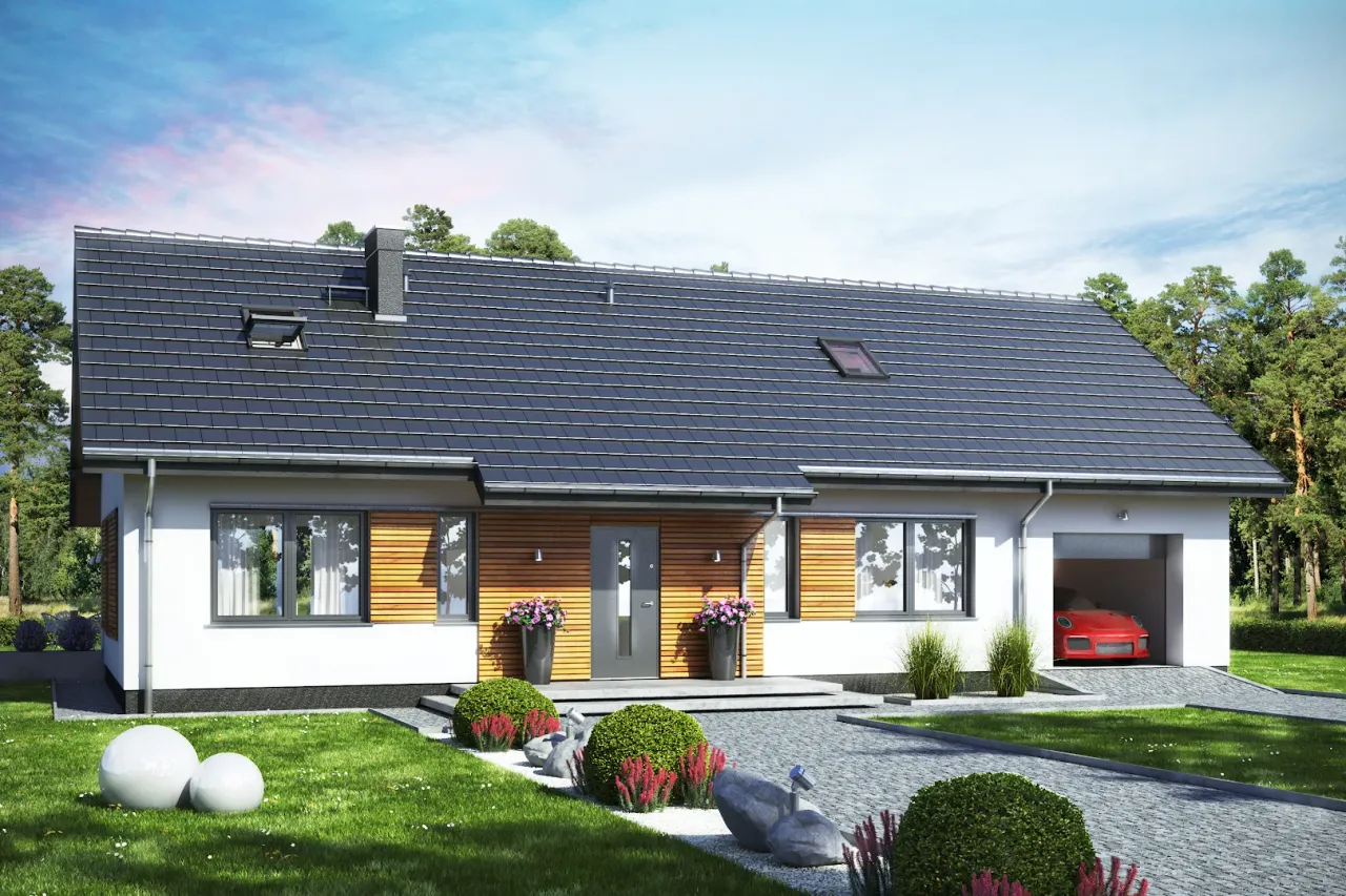 Wypełnij formularz i otrzymaj rysunki w pdf z dokładnymi wymiarami budynku i pomieszczeń (długość, szerokość, wysokość) dla projektu Terrier Max z garażem