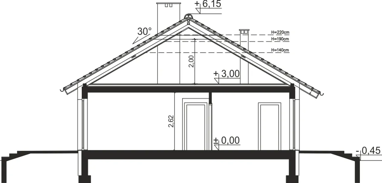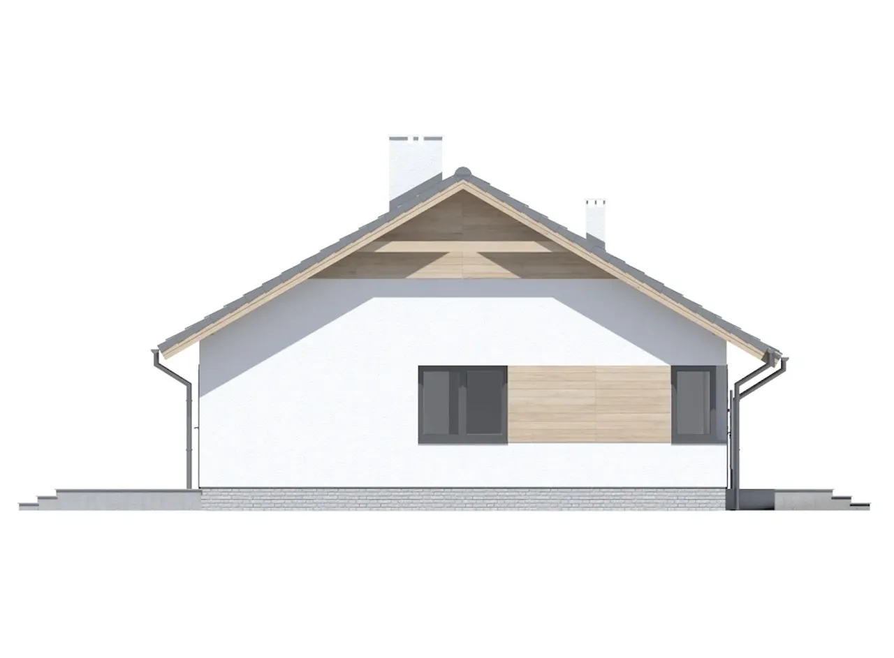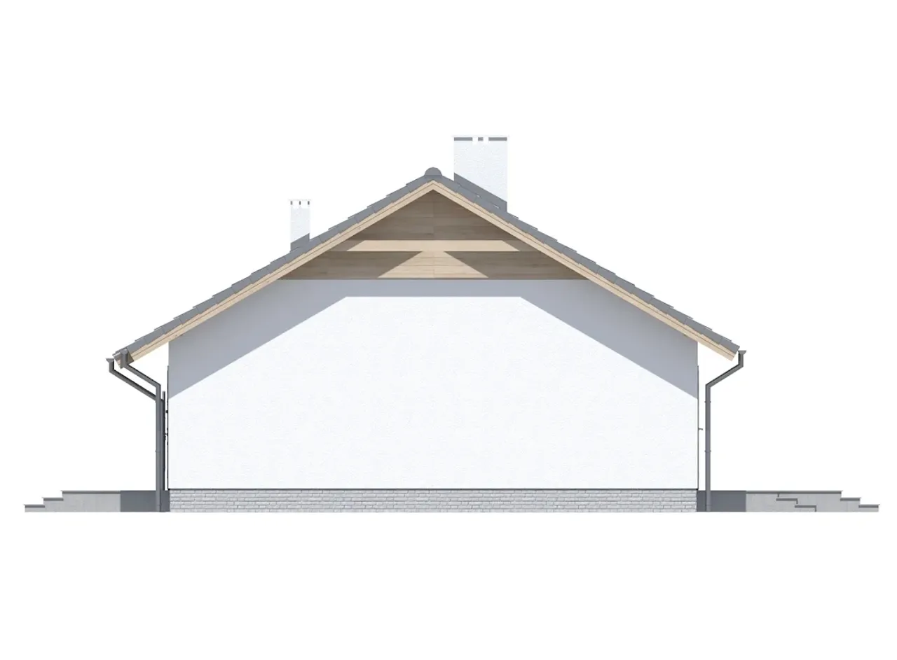 Konstrukcja oparta na betonowych fundamentach oraz dwuwarstwowych ścianach z betonu komórkowego, z warstwą izolacji o grubości 20 cm, skutecznie ogranicza straty ciepła i daje poczucie bezpieczeństwa. Gęstożebrowy strop Teriva oraz solidna więźba dachowa kryta dachówką cementową lub ceramiczną podnoszą trwałość budynku. Dach dwuspadowy z kątem nachylenia 30° i kalenicą równoległą do drogi wpasowuje się w nowoczesne trendy, a układ pomieszczeń sprzyja wygodnej codzienności.