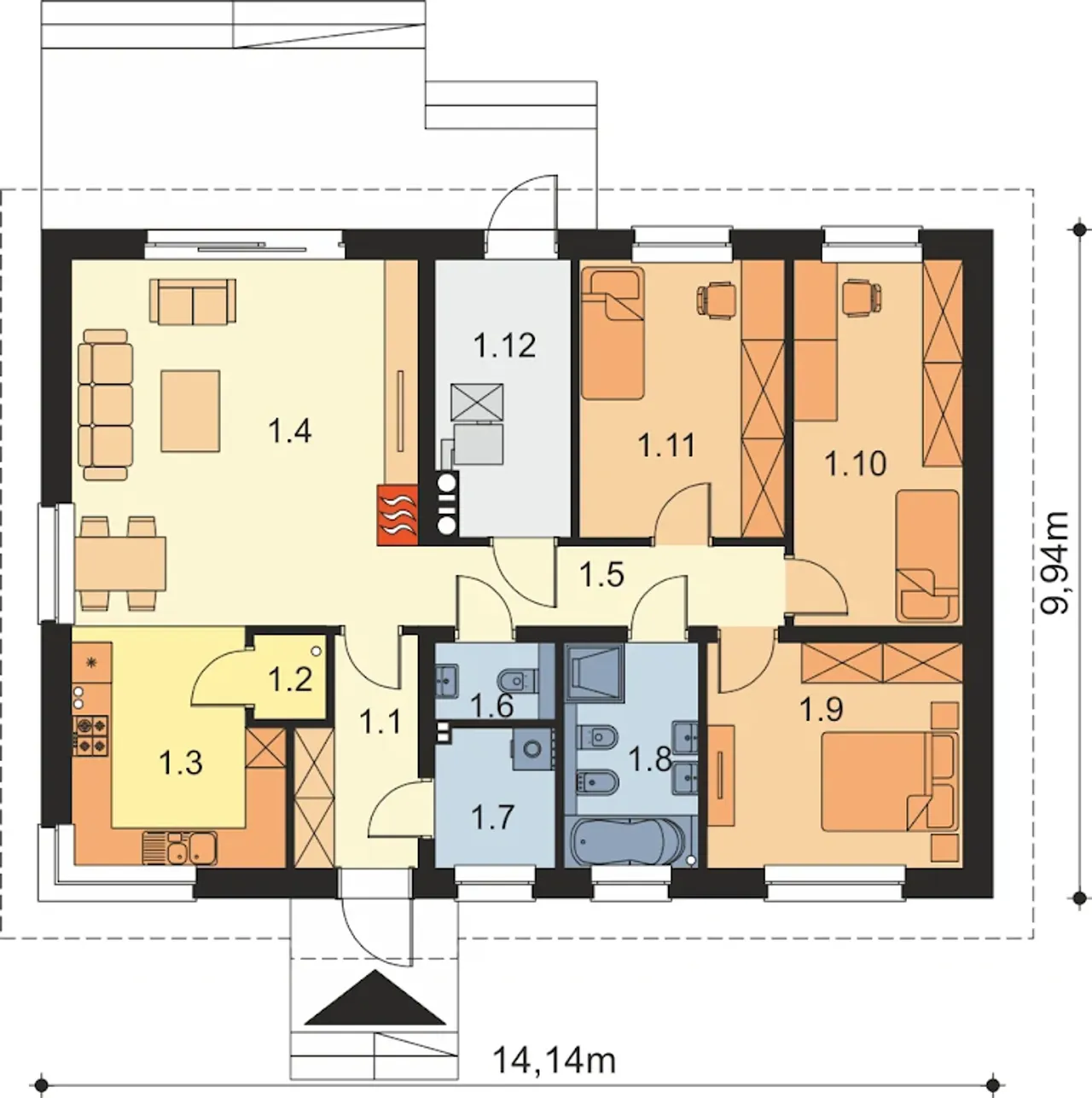 Wybierając ten projekt, stawiasz na wygodę użytkowania, solidne materiały i praktyczną organizację przestrzeni. Tu każdy domownik znajdzie swoją prywatną strefę, a wspólne chwile umili przytulny kominek oraz słoneczny taras.