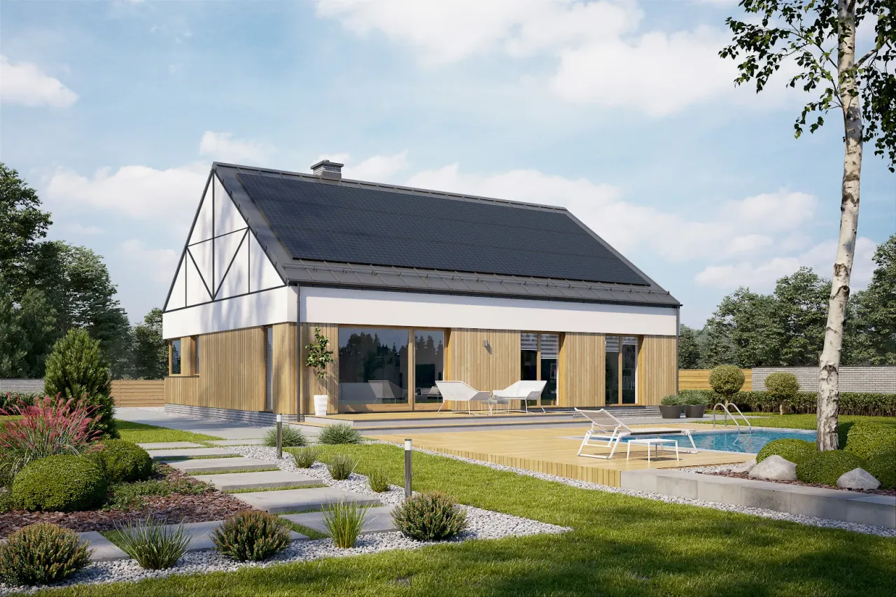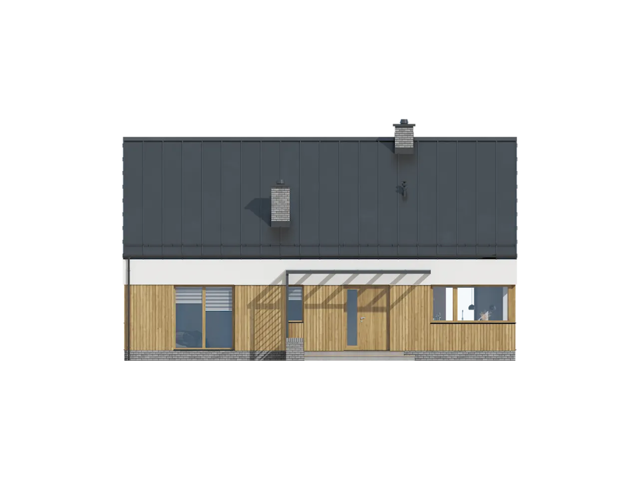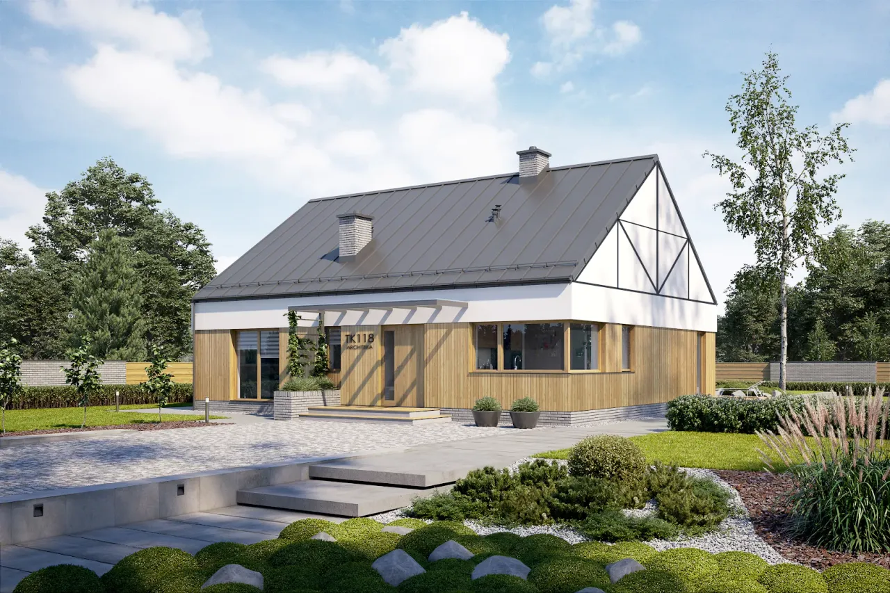- Elewacje: tynk strukturalny i okładzina drewniana.