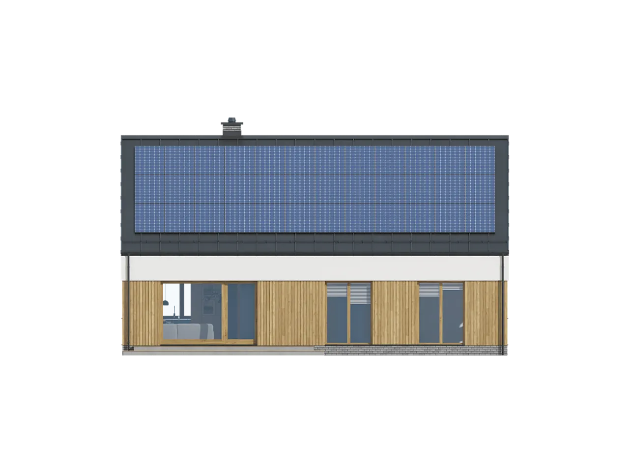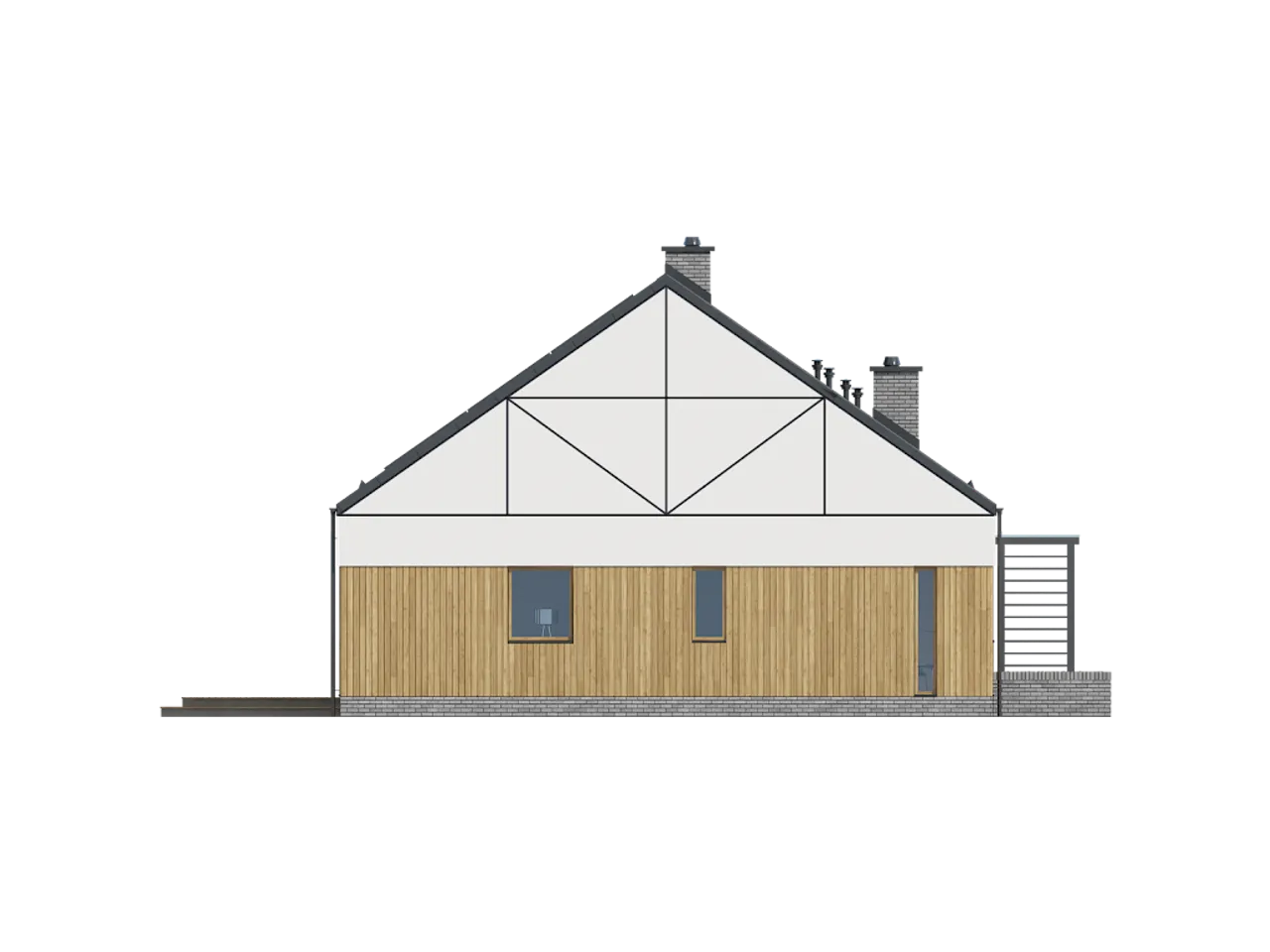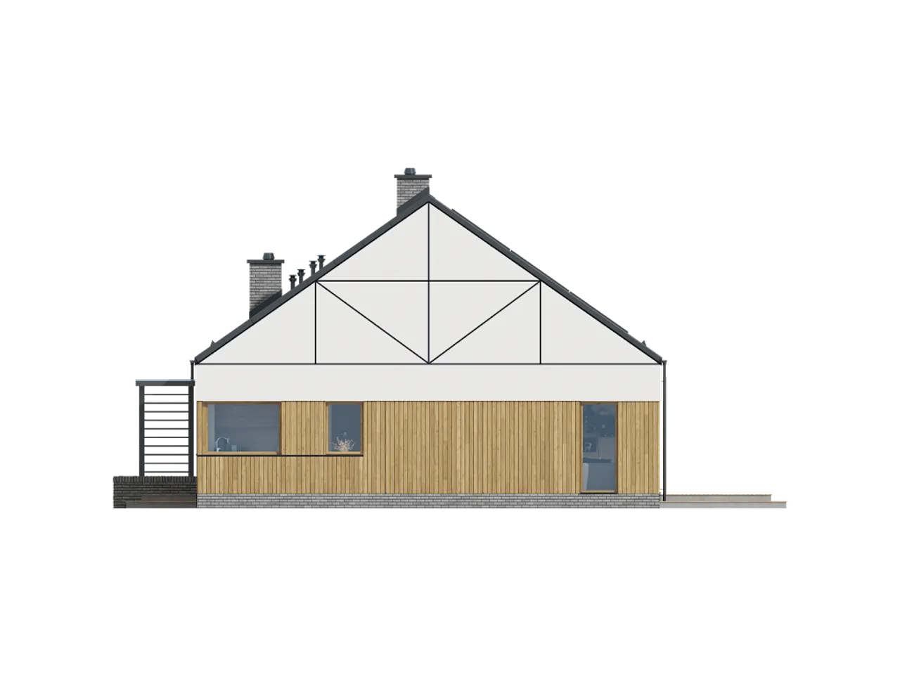 - Elewacje: tynk strukturalny i okładzina drewniana.