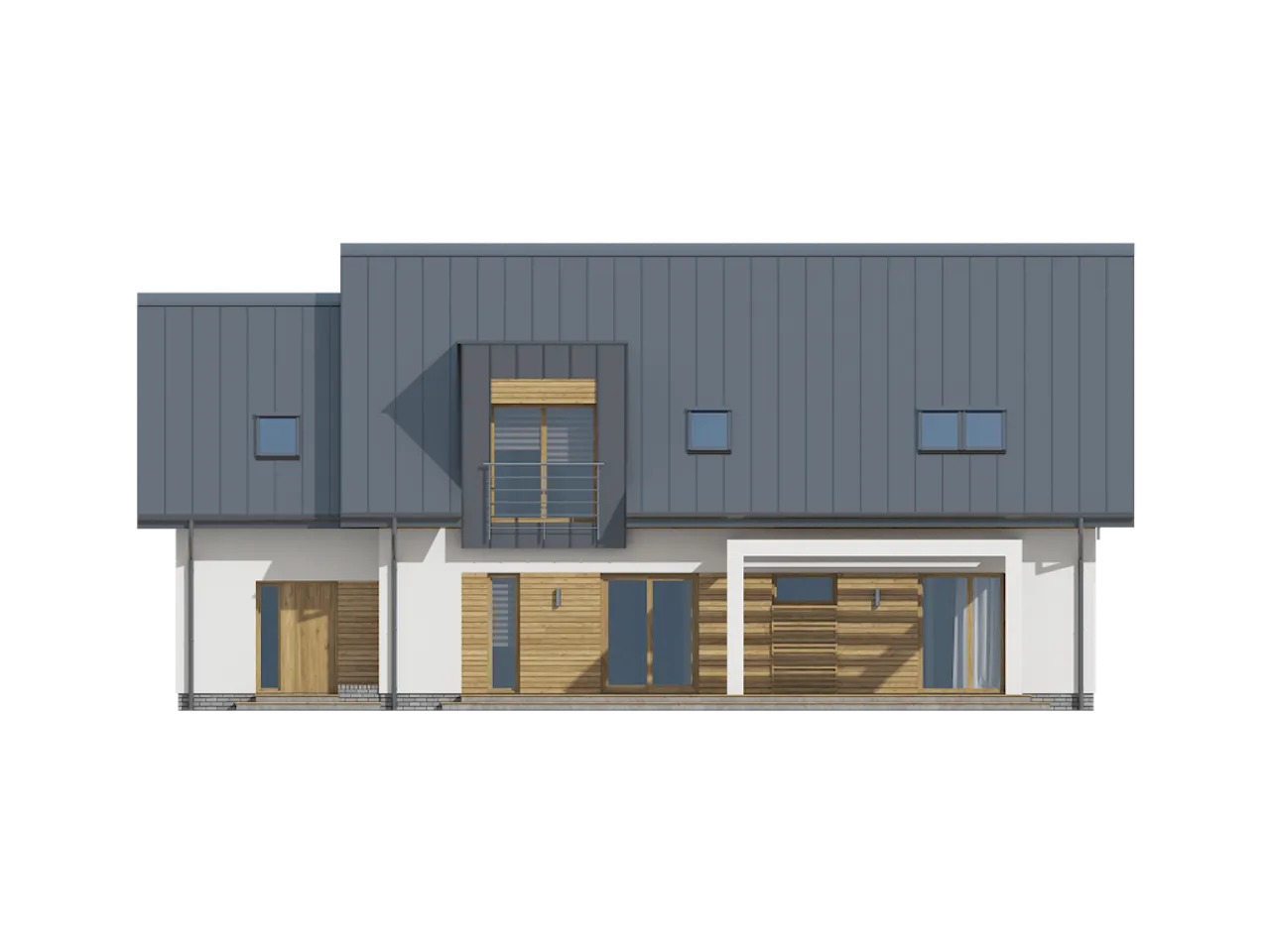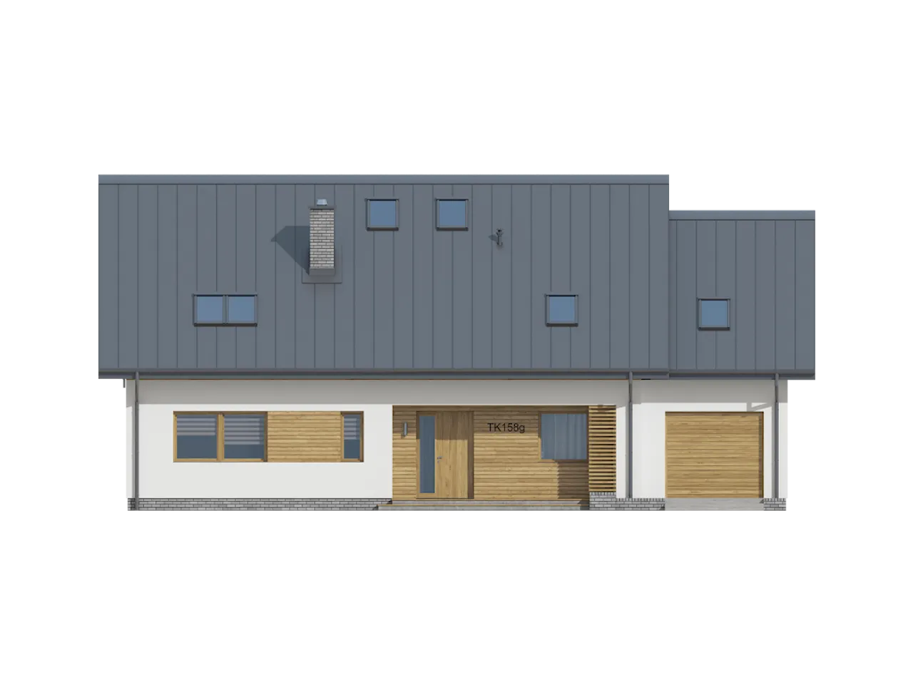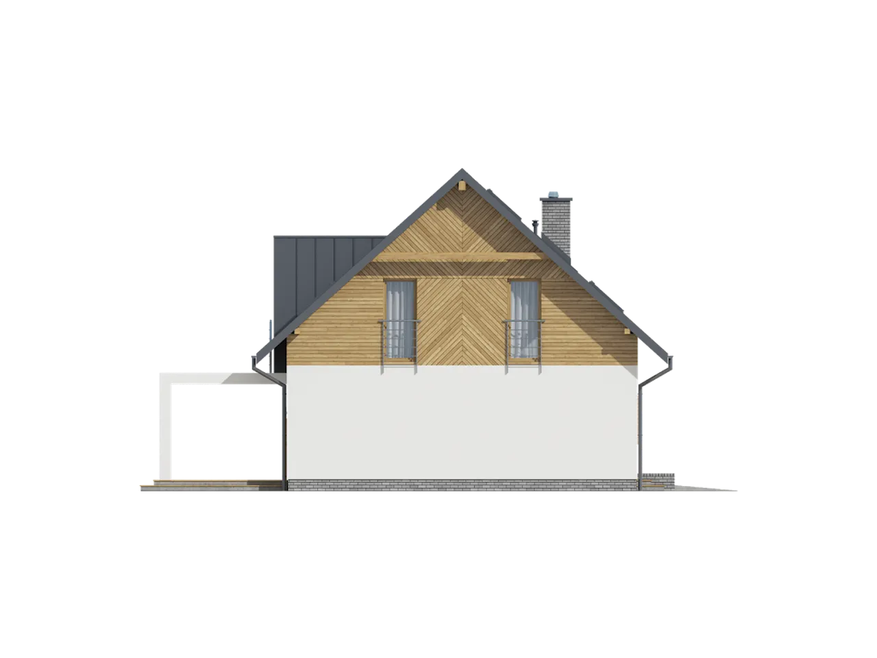 - Elewacje: tynk strukturalny i okładzina drewniana.