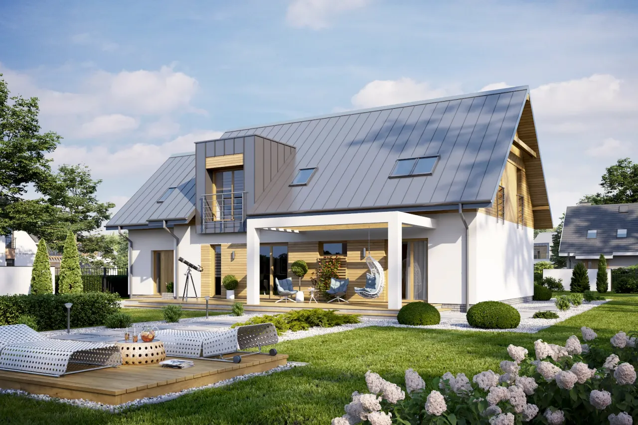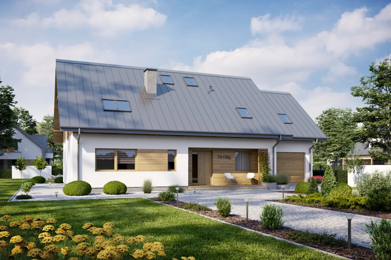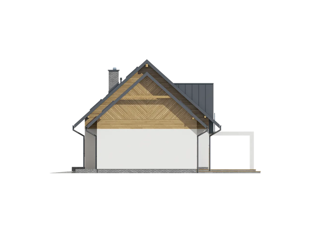 - Elewacje: tynk strukturalny i okładzina drewniana.
