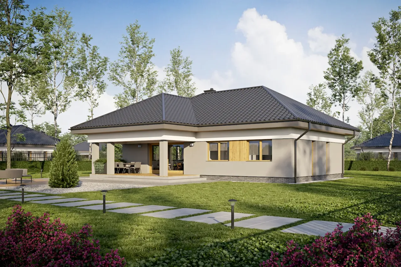 Projekt domu TK 69 to prawdziwa perełka wśród współczesnych projektów domów jednorodzinnych. Jego unikatowa elewacja, przywodząca na myśl eleganckie mieszanki nowoczesności z klasycznymi elementami, sprawia wrażenie, jakby każdy detal był dokładnie przemyślany. Harmonijne połączenie materiałów wykończeniowych gwarantuje, że budynek będzie się pięknie prezentować w różnorodnych otoczeniach. Niezwykle przestronne wnętrze, w którym przeplatają się otwarte przestrzenie z bardziej kameralnymi zakątkami, idealnie nadaje się dla rodziny, pragnącej komfortu i funkcjonalności przy jednoczesnym zachowaniu prywatności. Projekt TK 69 wydaje się być stworzony z myślą o tych, którzy cenią sobie spokój i harmonię, ale też nie boją się wyrazić siebie poprzez nowatorskie rozwiązania architektoniczne.