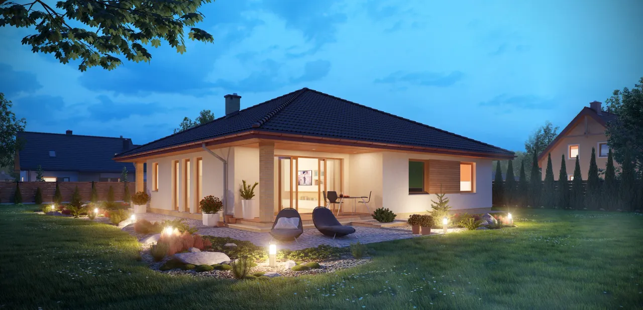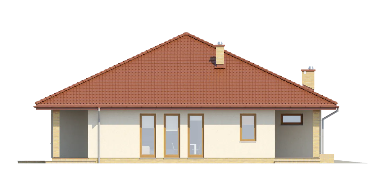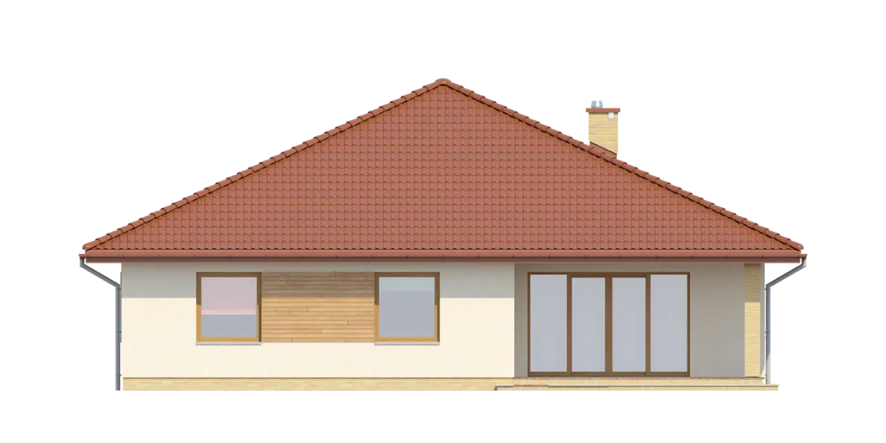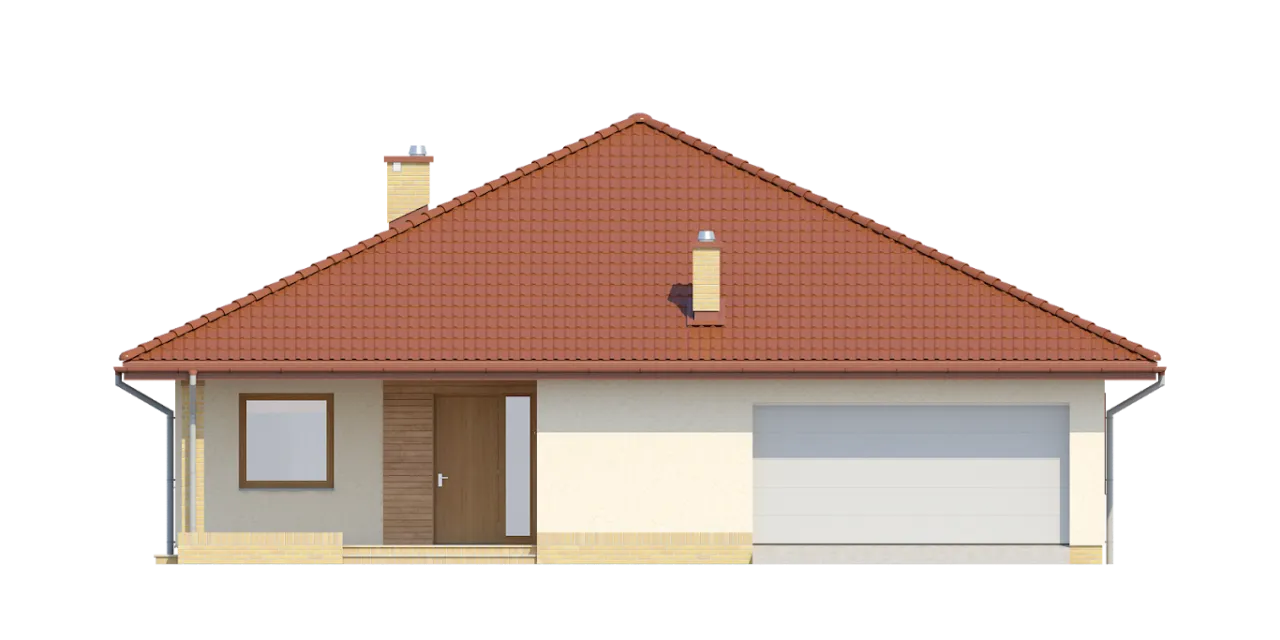 Projekt domu TK28 przedstawia dom parterowy z wbudowanym garażem dwustanowiskowym. Układ domu dzieli się na dwie części: dzienną i nocną. Część dzienną tworzą wiatrołap, przestronny salon z jadalnią, kuchnia oraz kotłownia. W części nocnej znajduja się trzy wygodne sypialnie oraz ogólnodostepna łazienka i garderoba. Projekt domu TK28 jest wygodny i funkcjonalny.