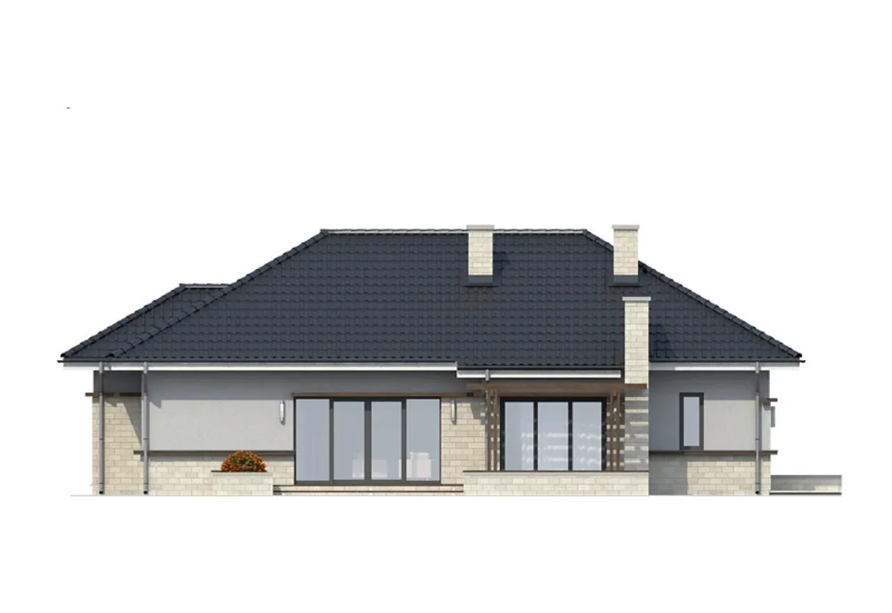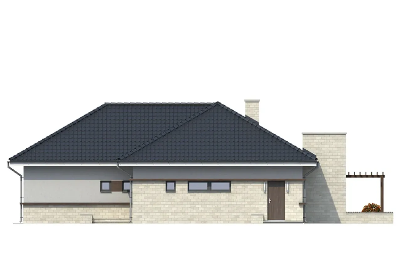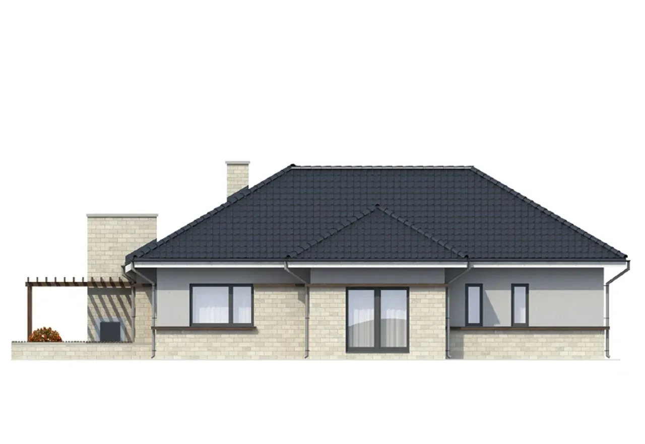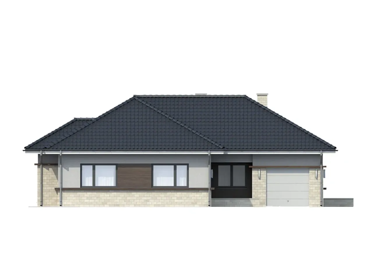 Projekt domu TK29 przedstawia dom parterowy z wbudowanym garażem jednostanowiskowym. Układ domu dzieli się na dwie części: dzienną i nocną. Część dzienną tworzą wiatrołap, przestronny salon, kuchnia z jadalnią, wc oraz pomieszczenie techniczne. W części nocnej znajduja się trzy wygodne sypialnie, w tym jedna z osobną łazienką oraz ogólnodostepna łazienka. Projekt domu TK29 jest wygodny i funkcjonalny.