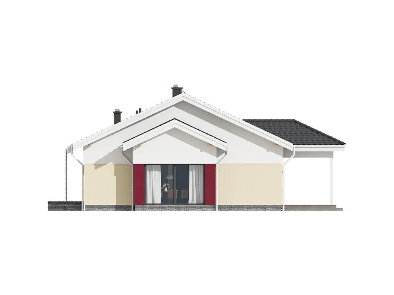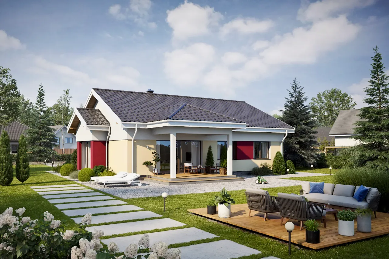 TK61 to nieduży, funkcjonalnie zaprojektowany dom parterowy, z trzema sporymi pokojami i dużym salonem otwartym na jadalnię z kominkiem i otwartą kuchnia.Kuchnię w zależności od potrzeb domowników można otworzyć na salon, albo zamknąć wykonując ściankę działową. Dom posiada zadaszony taras. Powierzchnia kotłowni daje możliwość wybrania różnych źródeł ogrzewania.