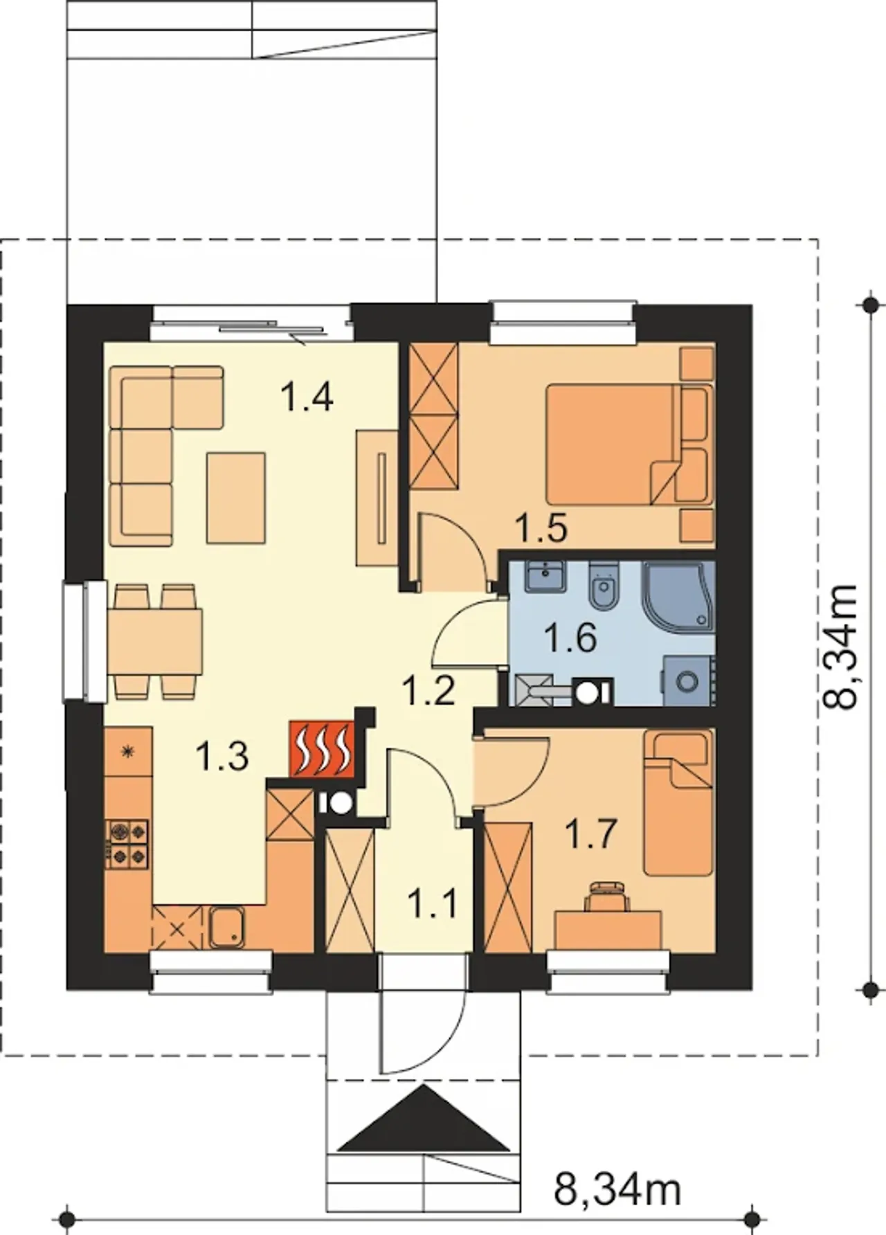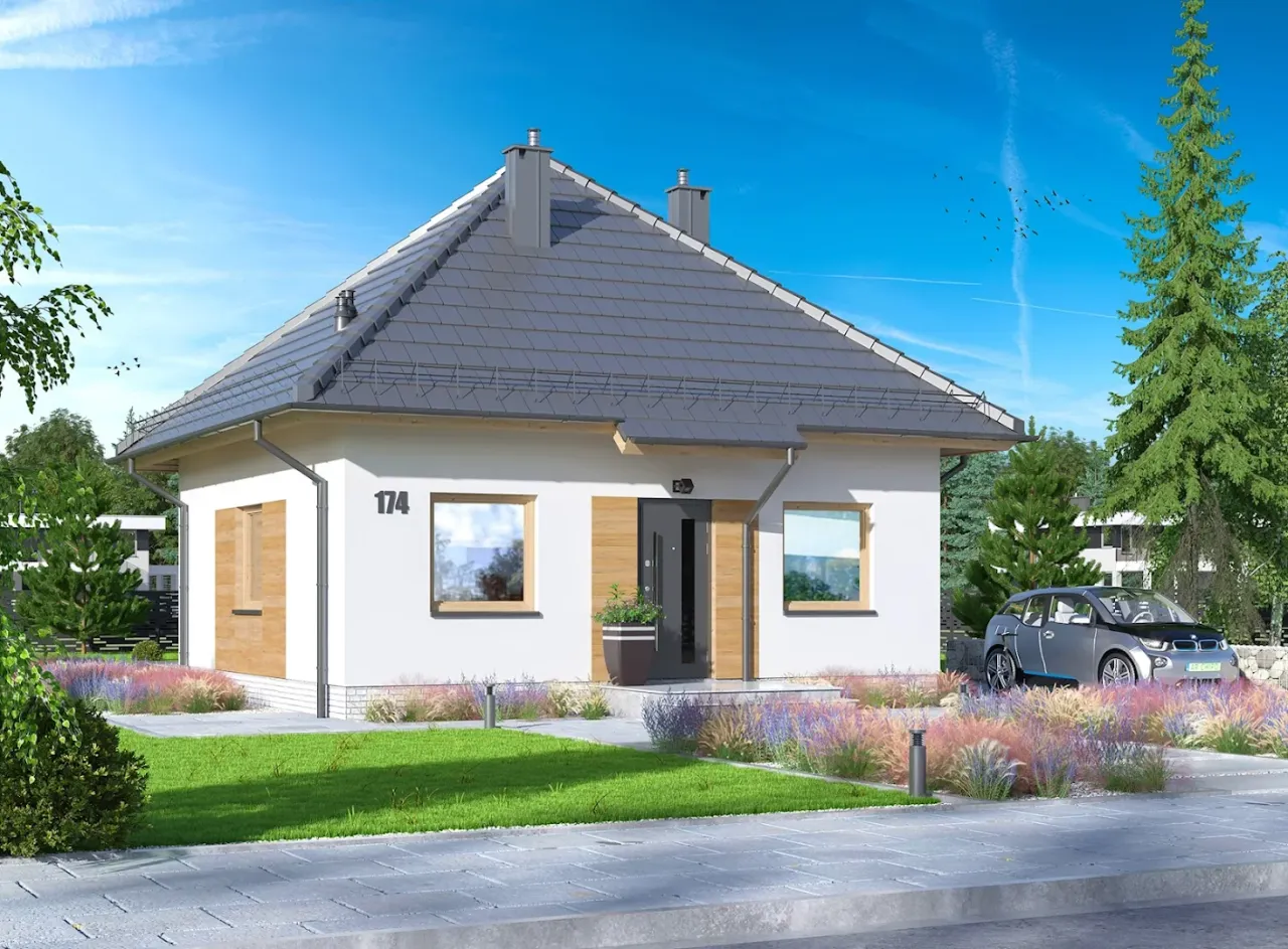 W projekcie przewidziano ogrzewanie gazowe oraz kominek w salonie. Dzięki temu mieszkańcy mogą swobodnie dostosować sposób ogrzewania do indywidualnych potrzeb. Trzy komfortowo zaplanowane pokoje stworzą wygodną przestrzeń dla rodziny, natomiast brak garażu pozwala maksymalnie wykorzystać powierzchnię użytkową domu.