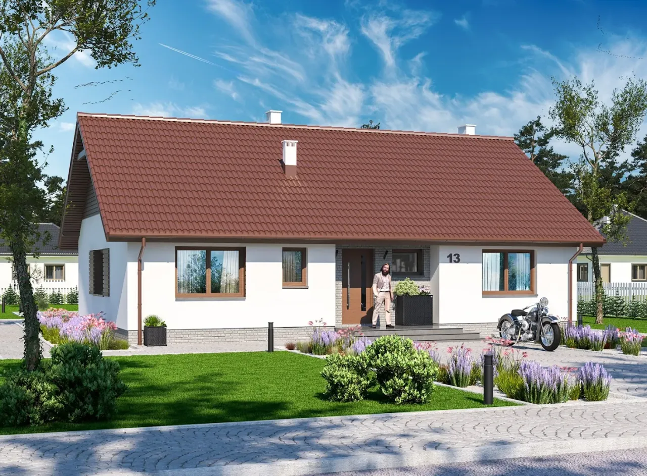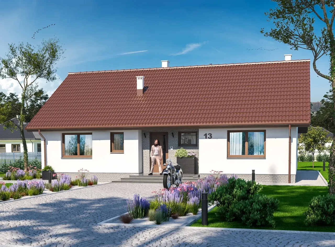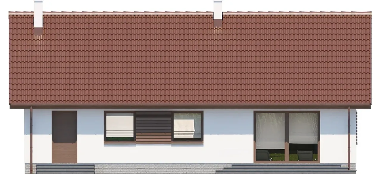 Brak garażu w bryle budynku oznacza maksymalnie wykorzystaną przestrzeń mieszkalną. Przemyślana komunikacja między pomieszczeniami oraz osobna spiżarnia przy kuchni wpływają na codzienną wygodę. Ogrzewanie gazowe lub na paliwo stałe daje elastyczność w wyborze sposobu ogrzewania. Dom wybudowany na podstawie projektu Tracja 5 z łatwością wpasuje się na działce z kalenicą równoległą do drogi, tworząc harmonijną całość z otoczeniem.